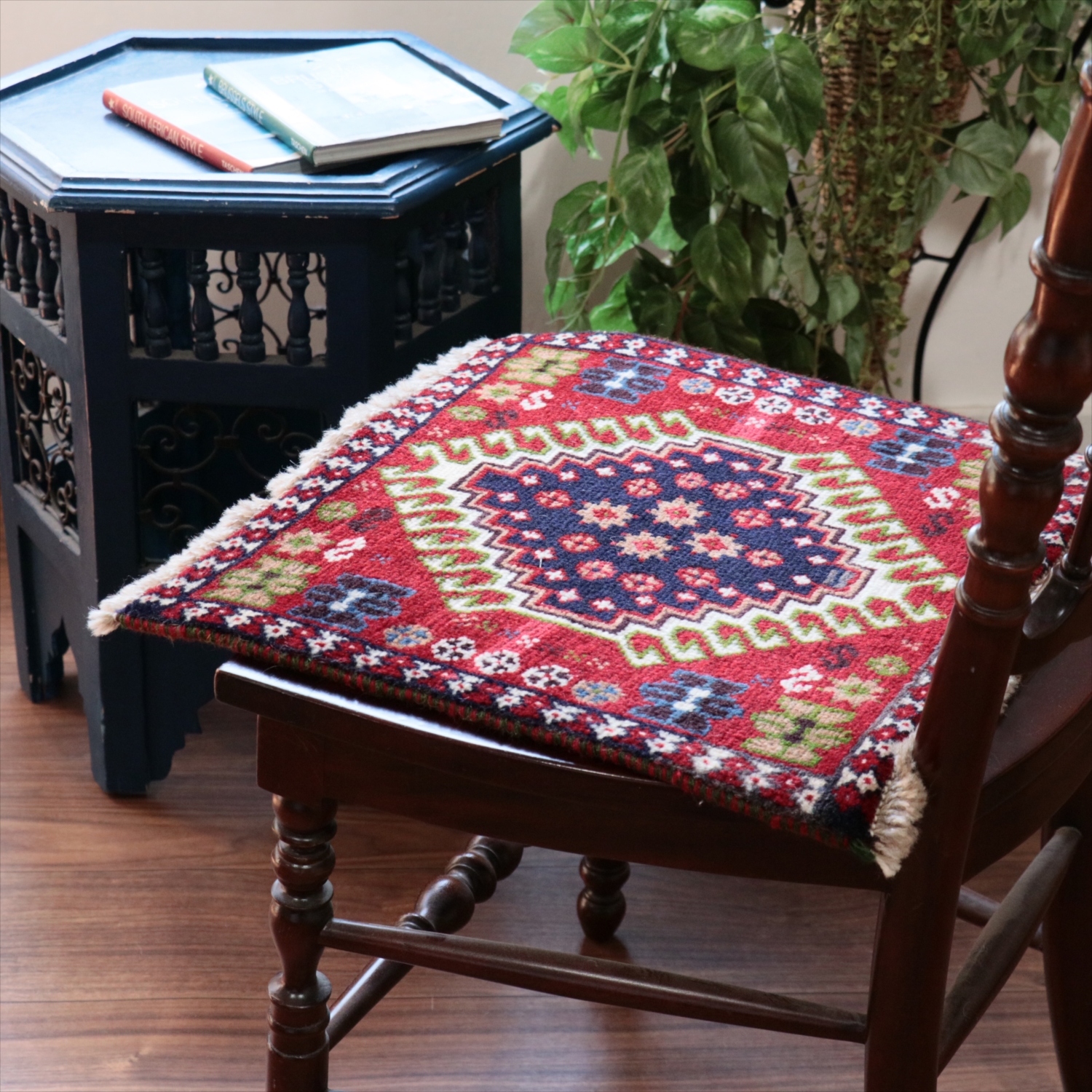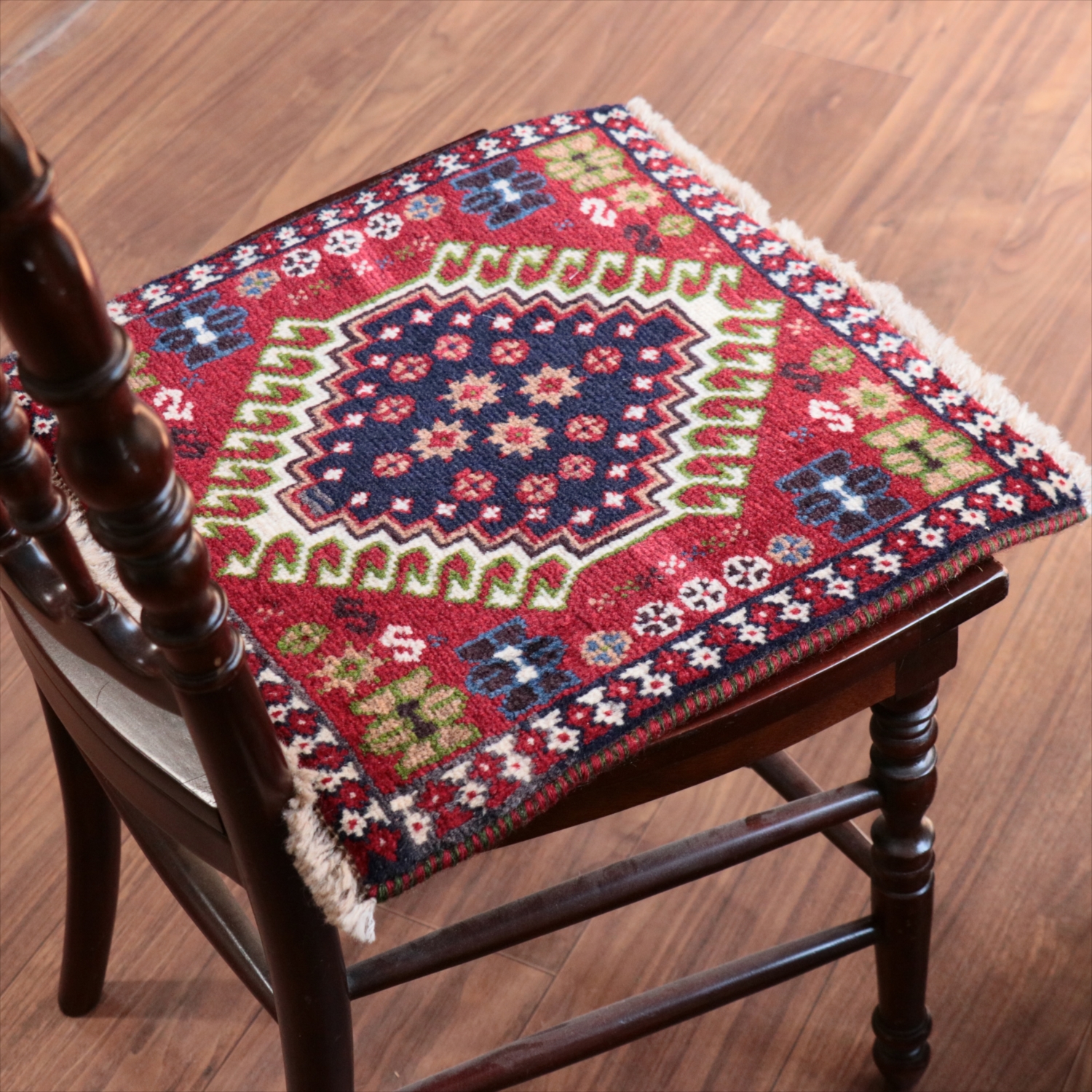 | 40cm角のミニサイズのラグ。小さいながらも、織りはしっかりしていて本格的です。多少ゆがみが気になりますが、ゆがみも含めて素朴な感じをお楽しみいただければと思います。 |