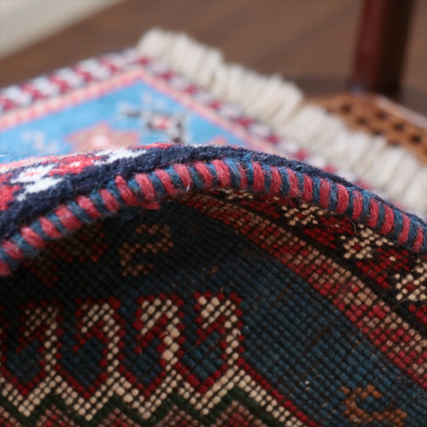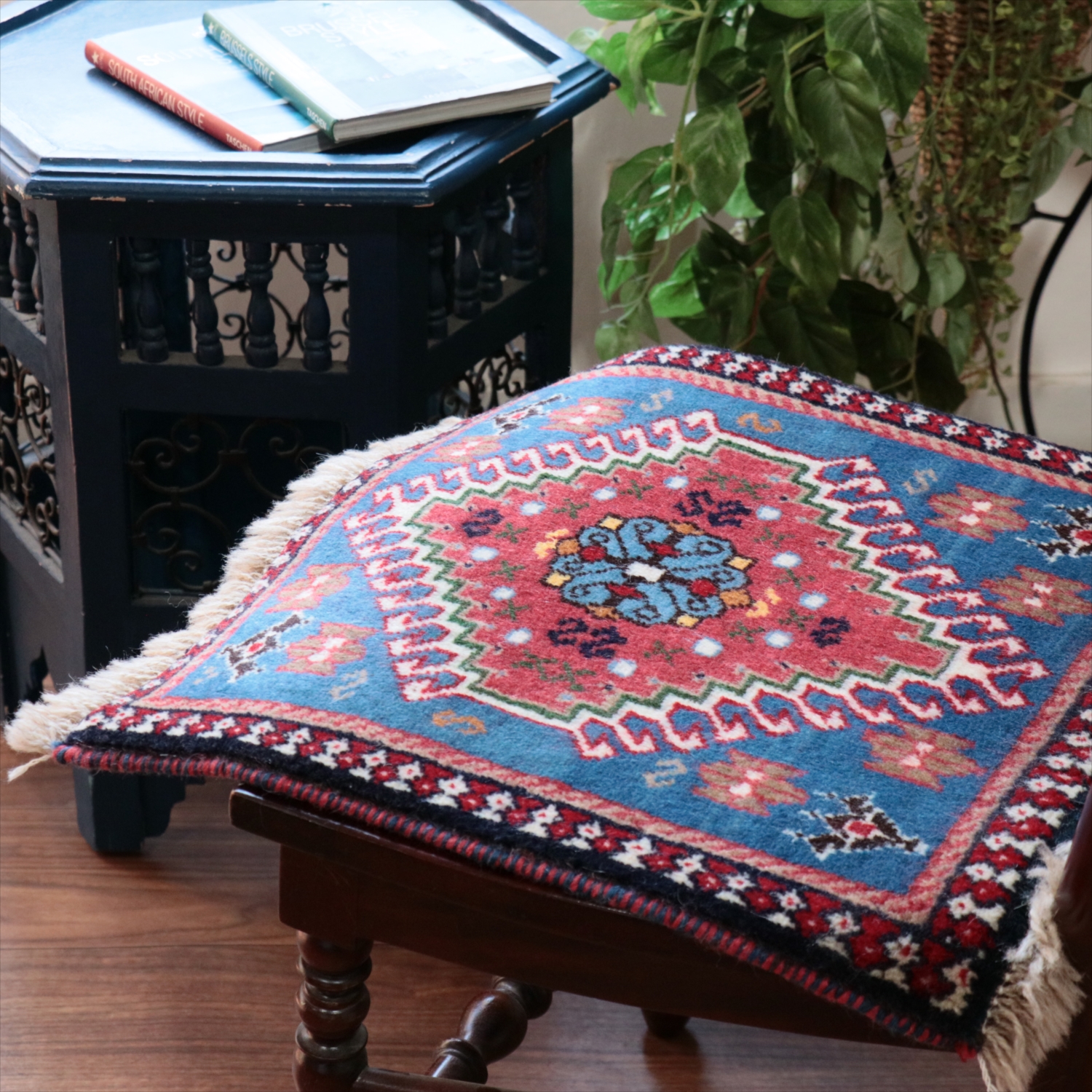 | 40cm角のミニサイズのラグ。小さいながらも、織りはしっかりしていて本格的です。多少ゆがみが気になりますが、ゆがみも含めて素朴な感じをお楽しみいただければと思います。 |