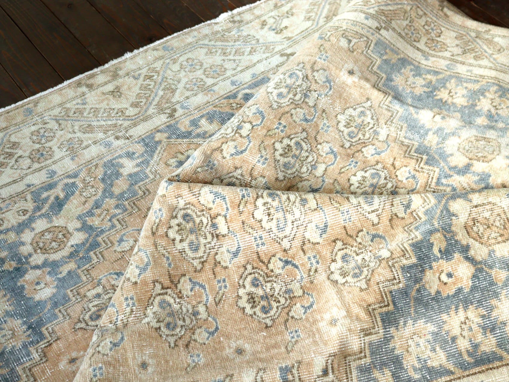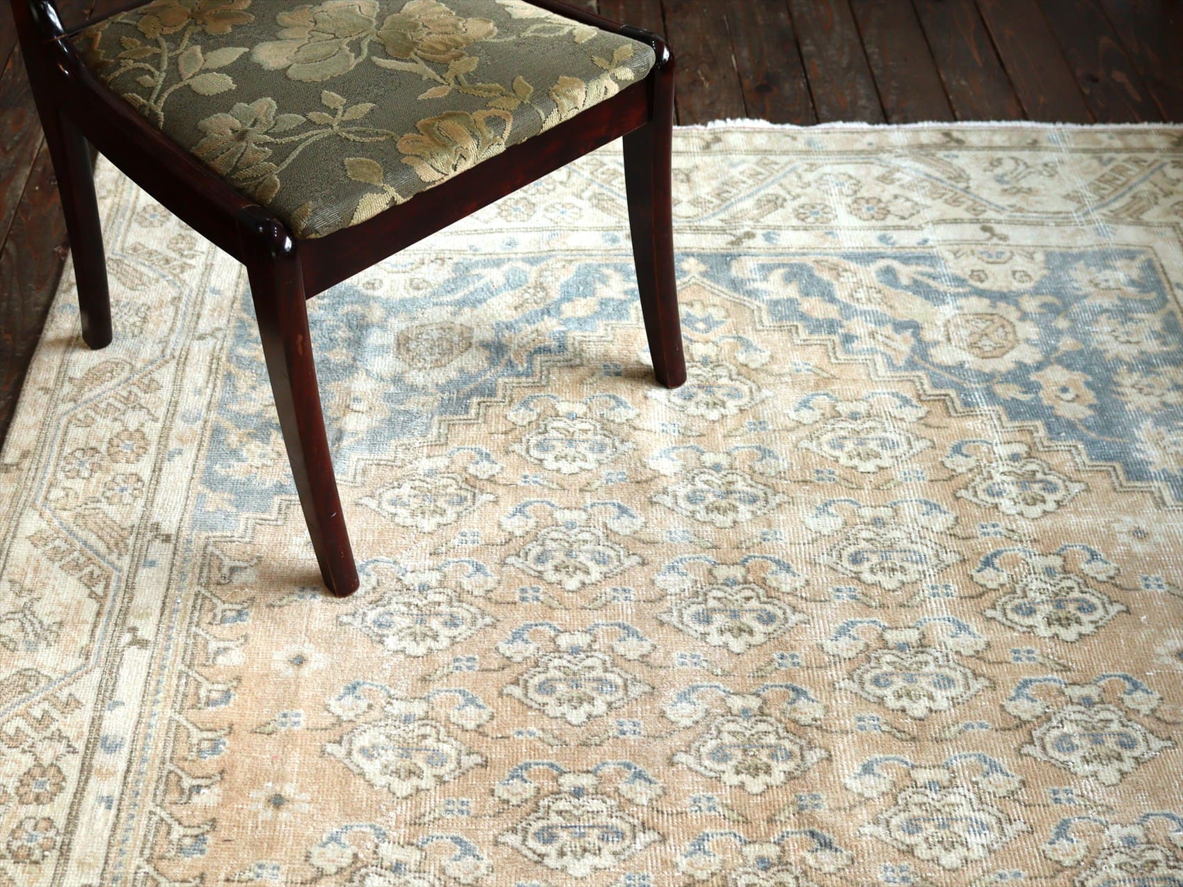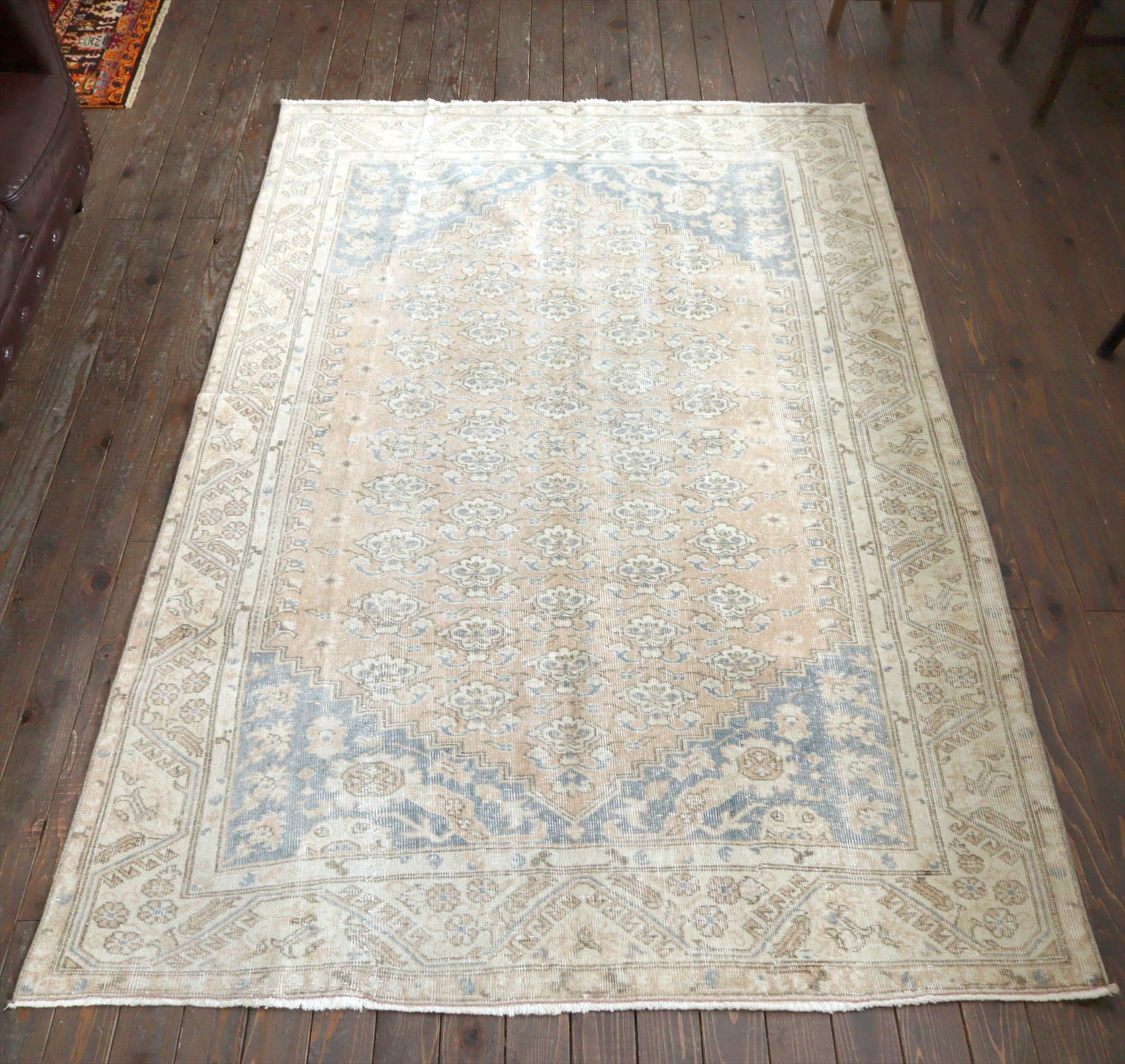 | ダメージが多く、使われなくなった古い手織りカーペットを、洗った上でブリーチをかけたユーズドラグです。当店では、アナトリア(トルコ地方)のオールドカーペットのみを使っています。擦りきれたパイルの下に、オリジナルのデザインが見えています。 |
