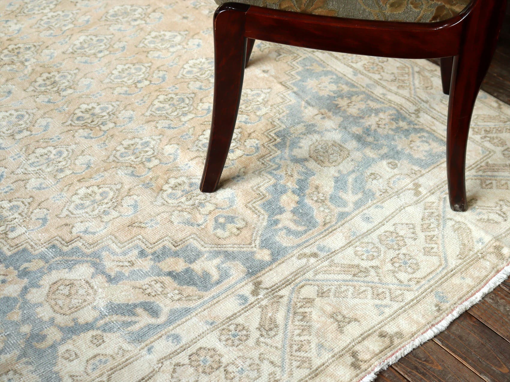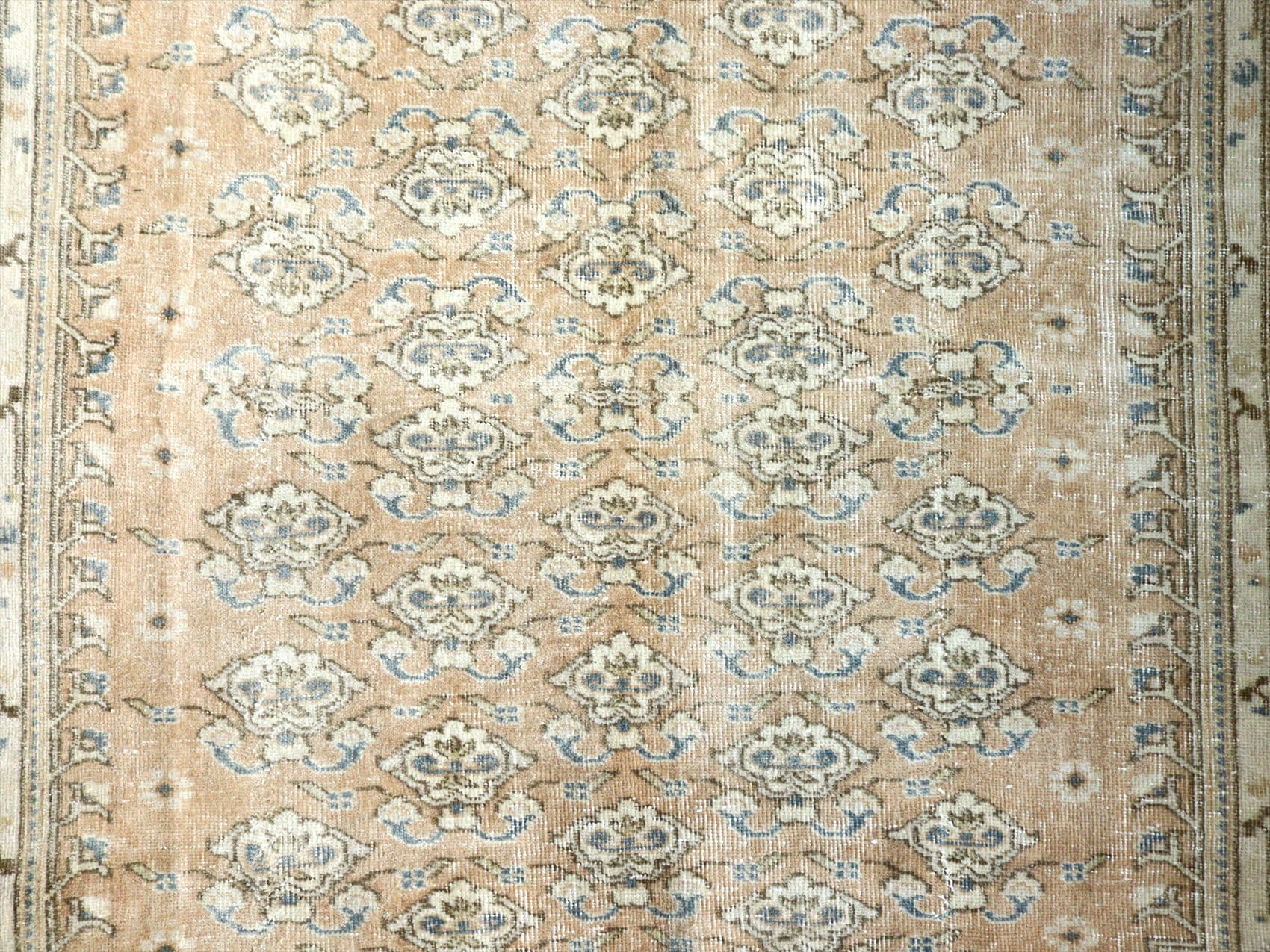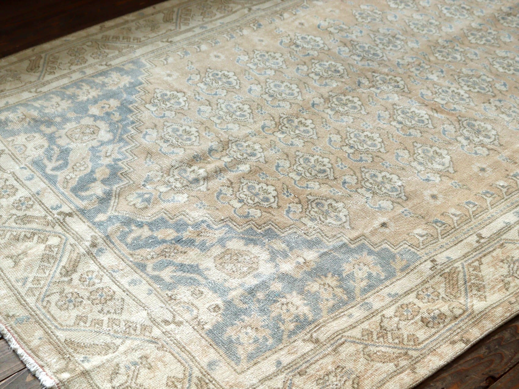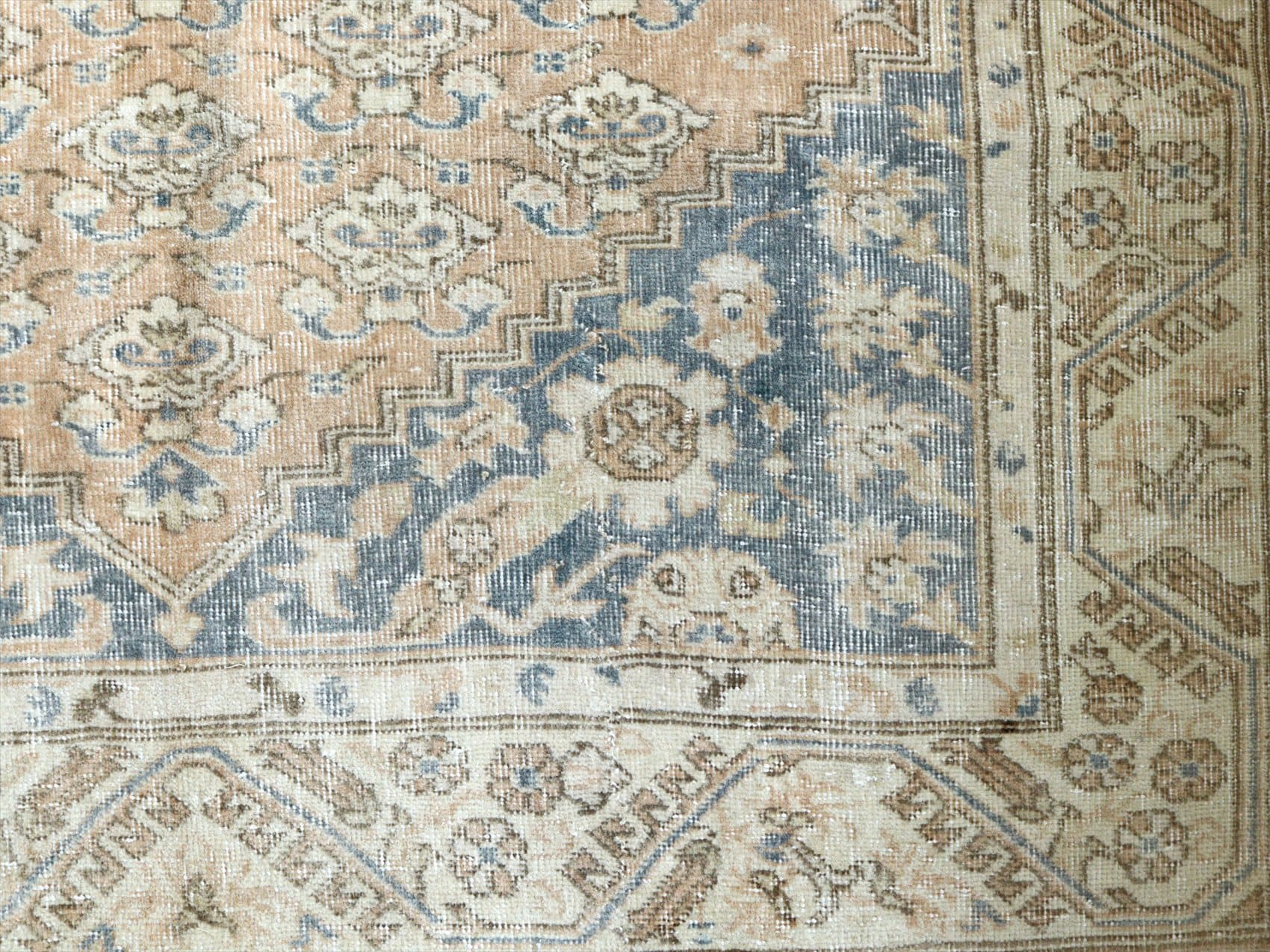 | ダメージが多く、使われなくなった古い手織りカーペットを、洗った上でブリーチをかけたユーズドラグです。当店では、アナトリア(トルコ地方)のオールドカーペットのみを使っています。擦りきれたパイルの下に、オリジナルのデザインが見えています。 |