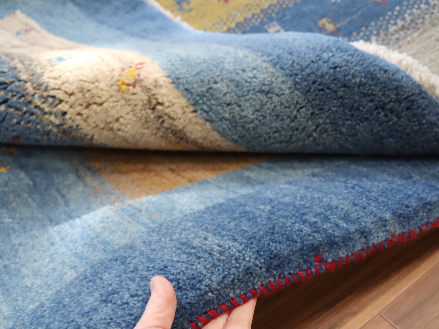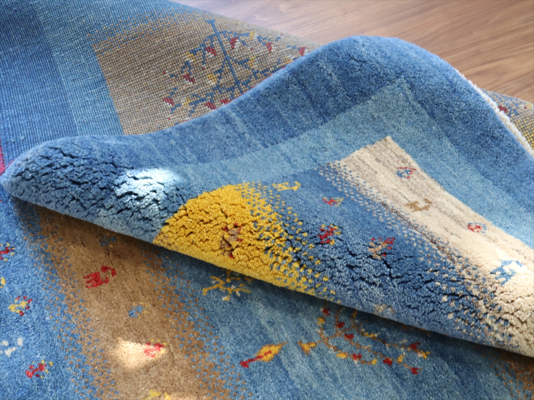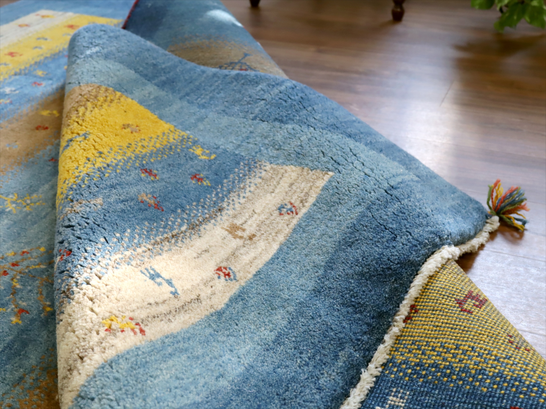 ギャッベ イラン産手織り 202x160cm ブルー&イエロー 生命の木 毛足の長いふかふかな織り