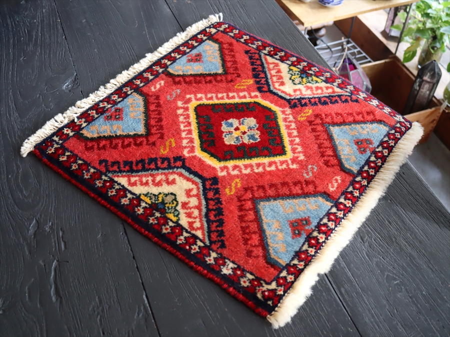 ヤラメ 手織りラグ ミニサイズ トライバルラグ 38x40cm 幾何学モチーフ 朱色