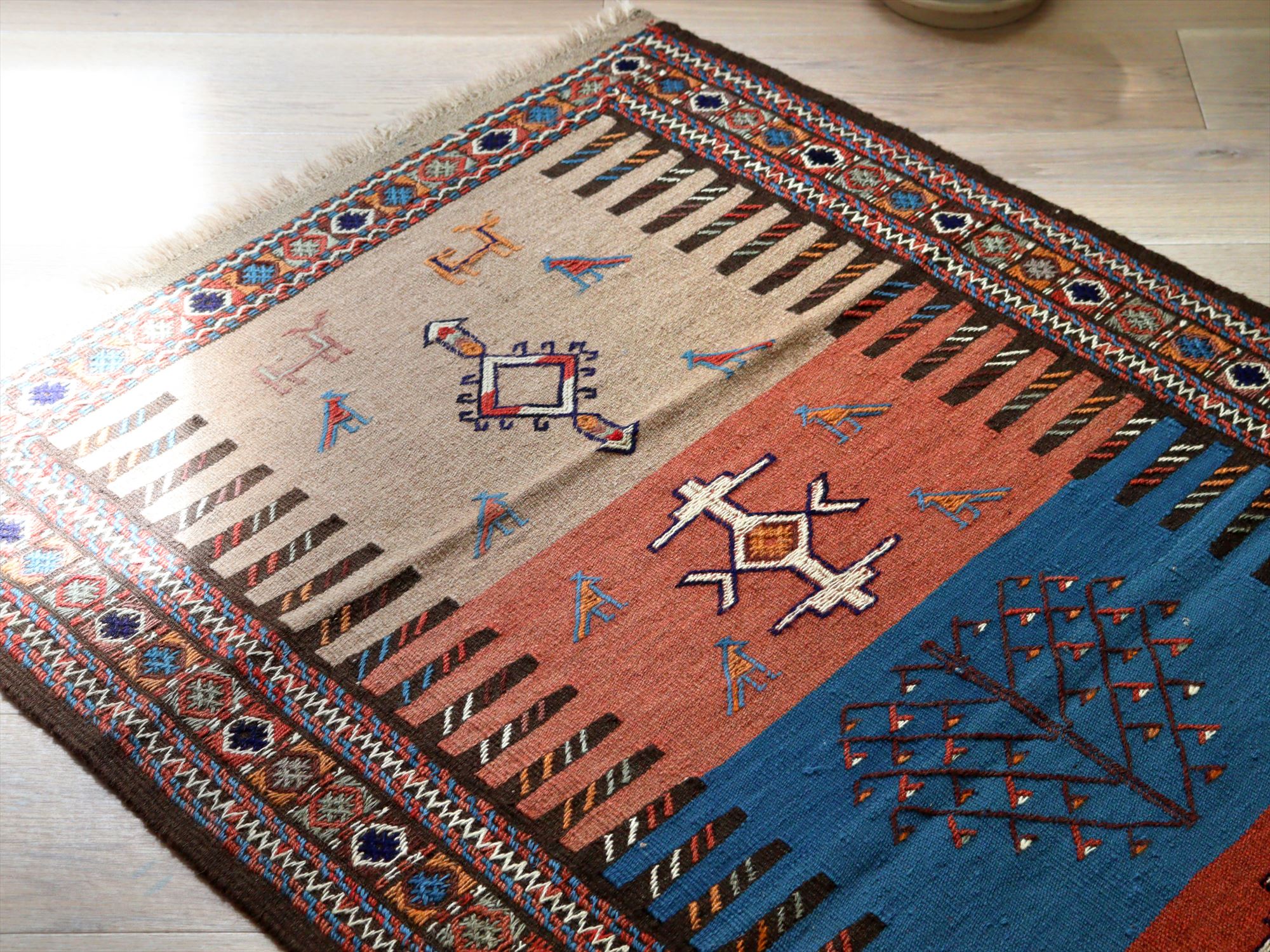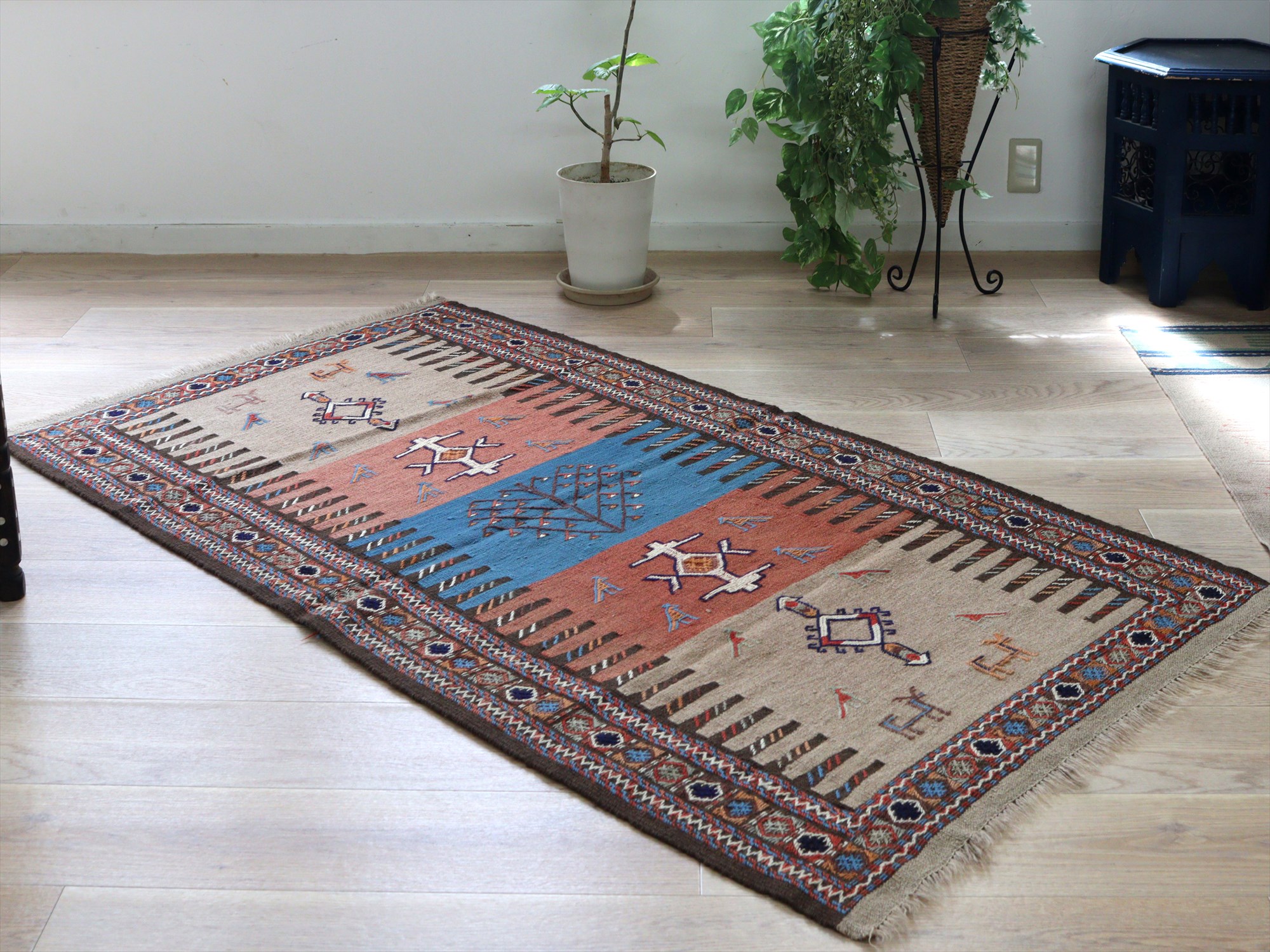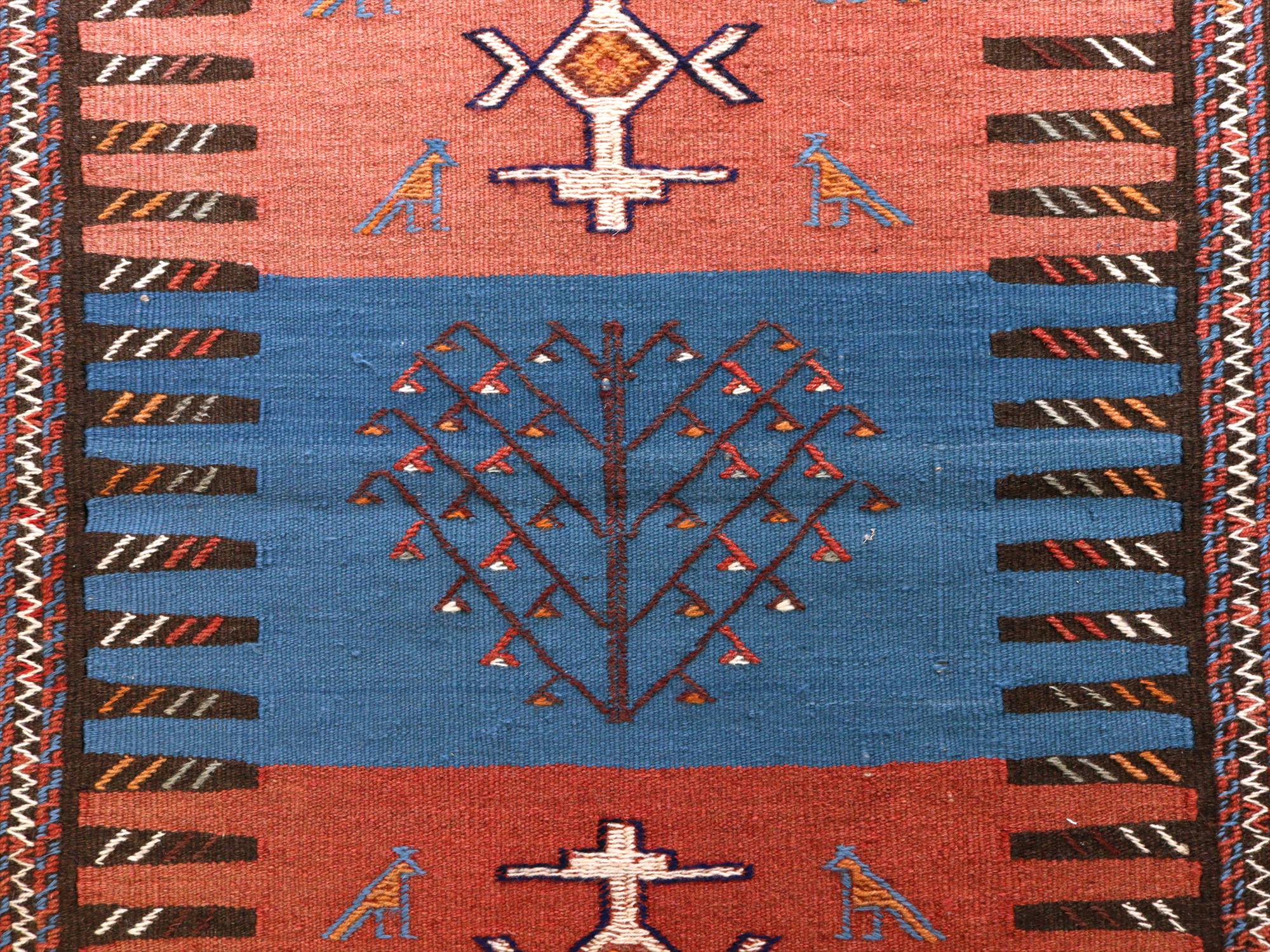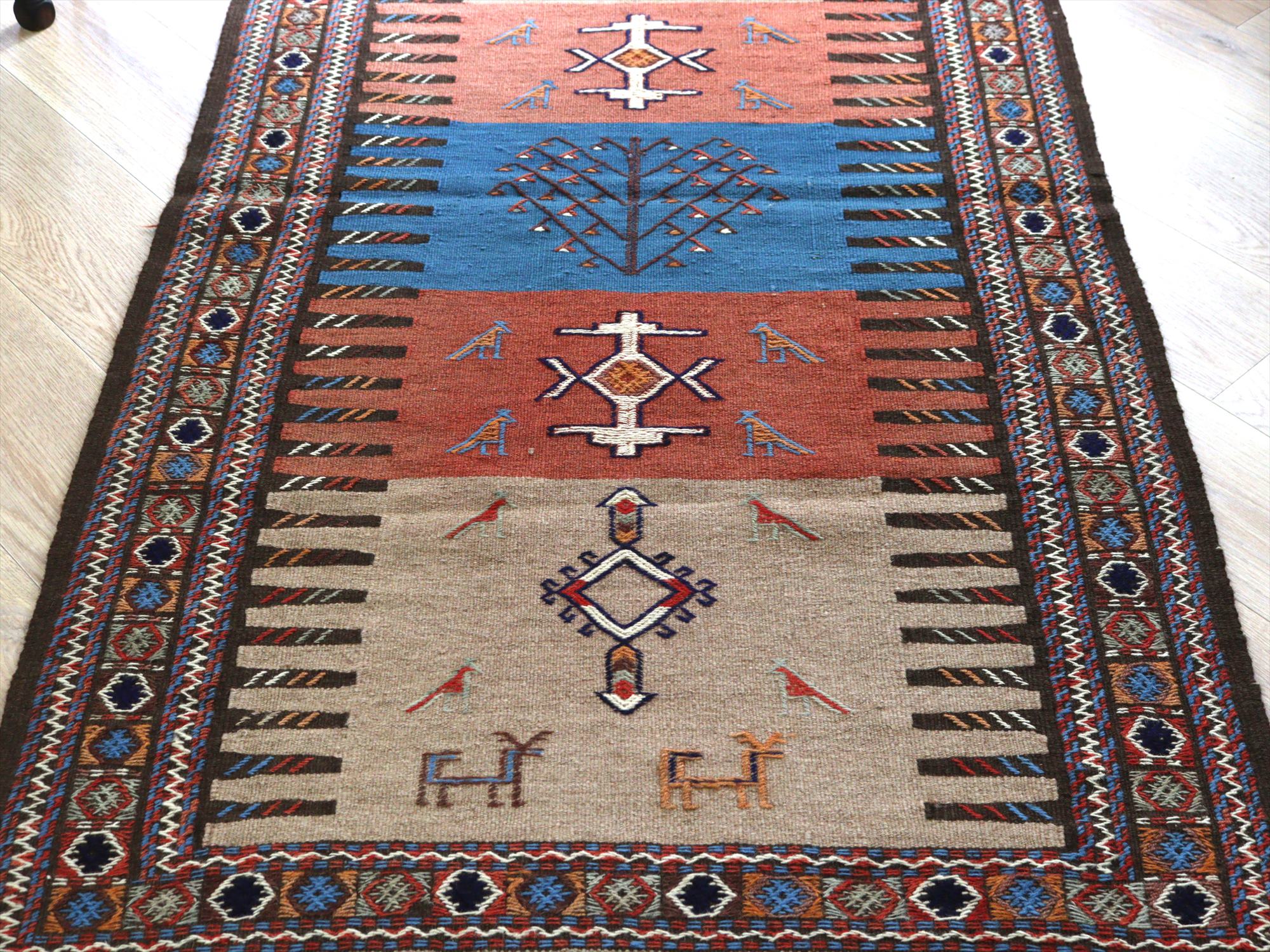 生命の樹やクジャク、ヤギなどが織られたグチャン族のキリム。ボーダー(額縁)部分には、幾何学モチーフが連なるように織られています。中央のブルーやレッド、ベージュベースの部分は平織りですが、モチーフはジジム織りで表現されています。 |