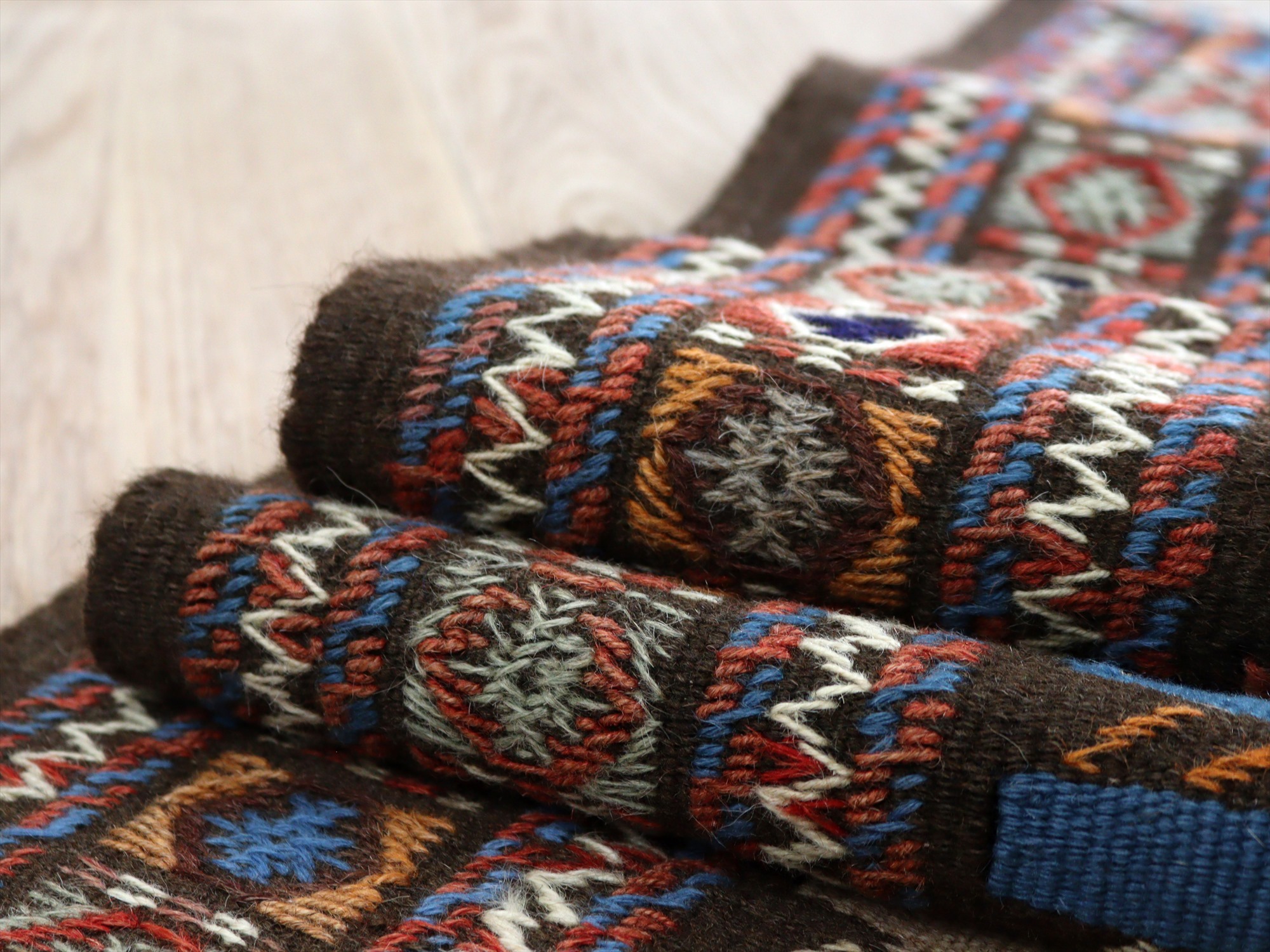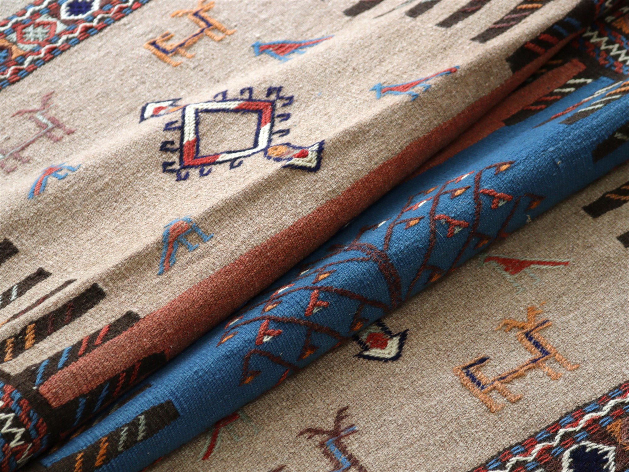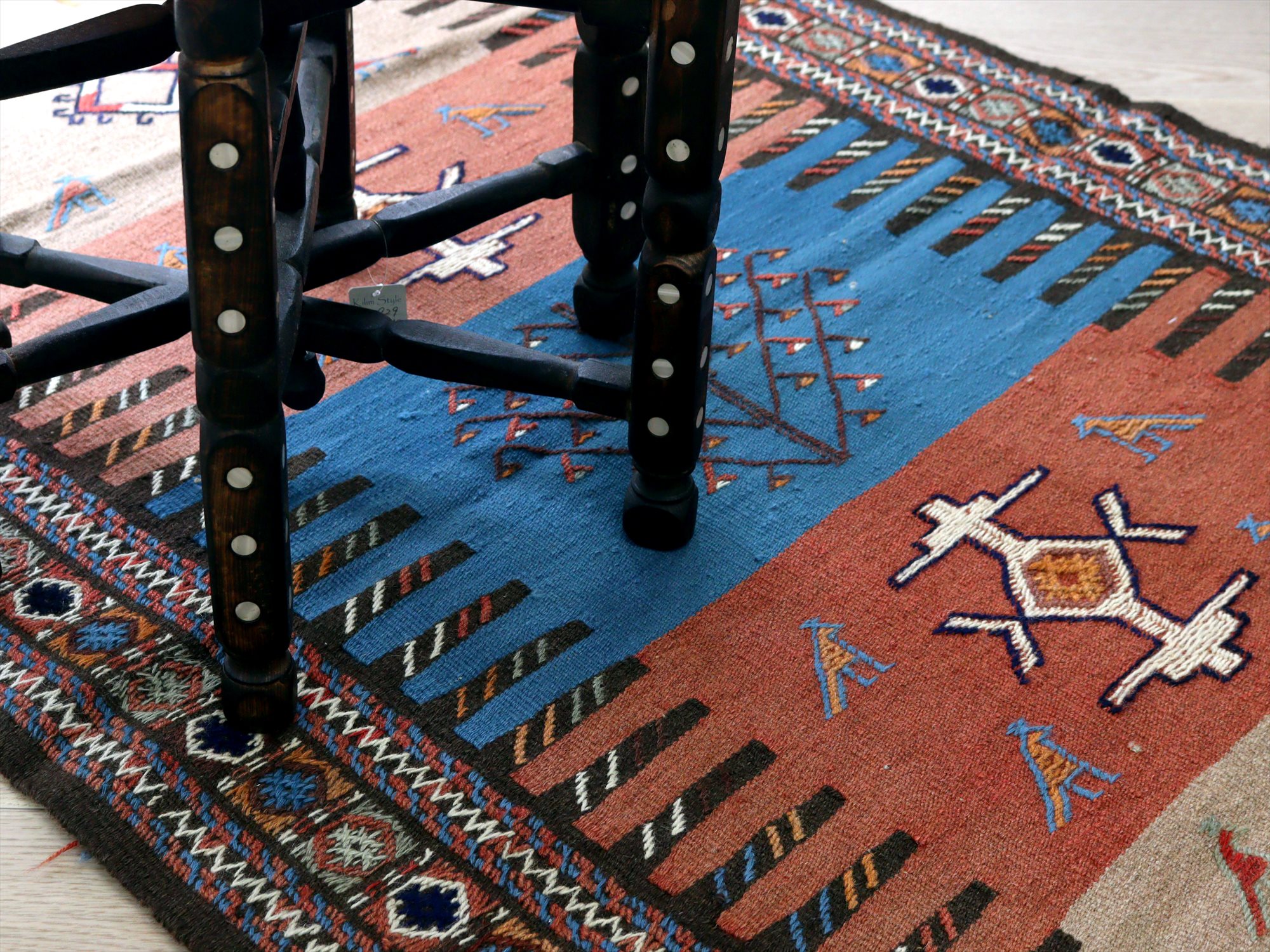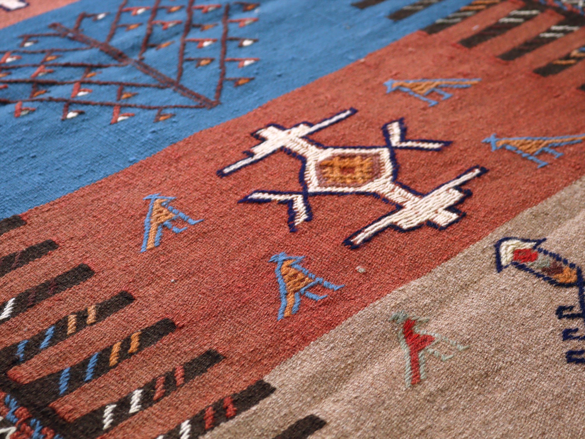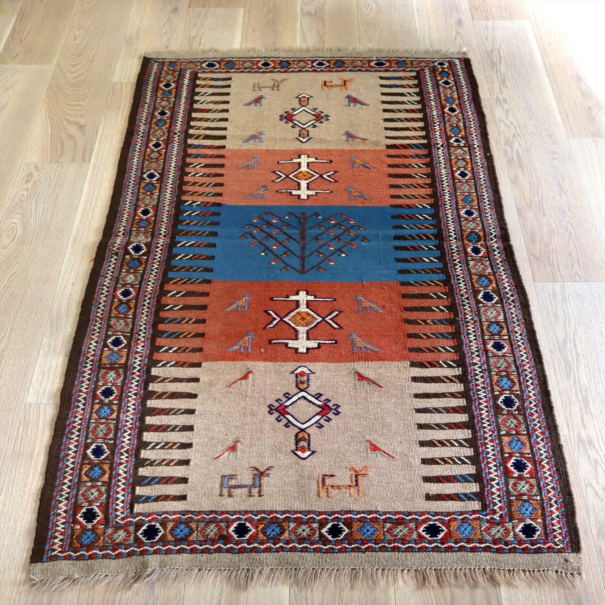 生命の樹やクジャク、ヤギなどが織られたグチャン族のキリム。ボーダー(額縁)部分には、幾何学モチーフが連なるように織られています。中央のブルーやレッド、ベージュベースの部分は平織りですが、モチーフはジジム織りで表現されています。 |