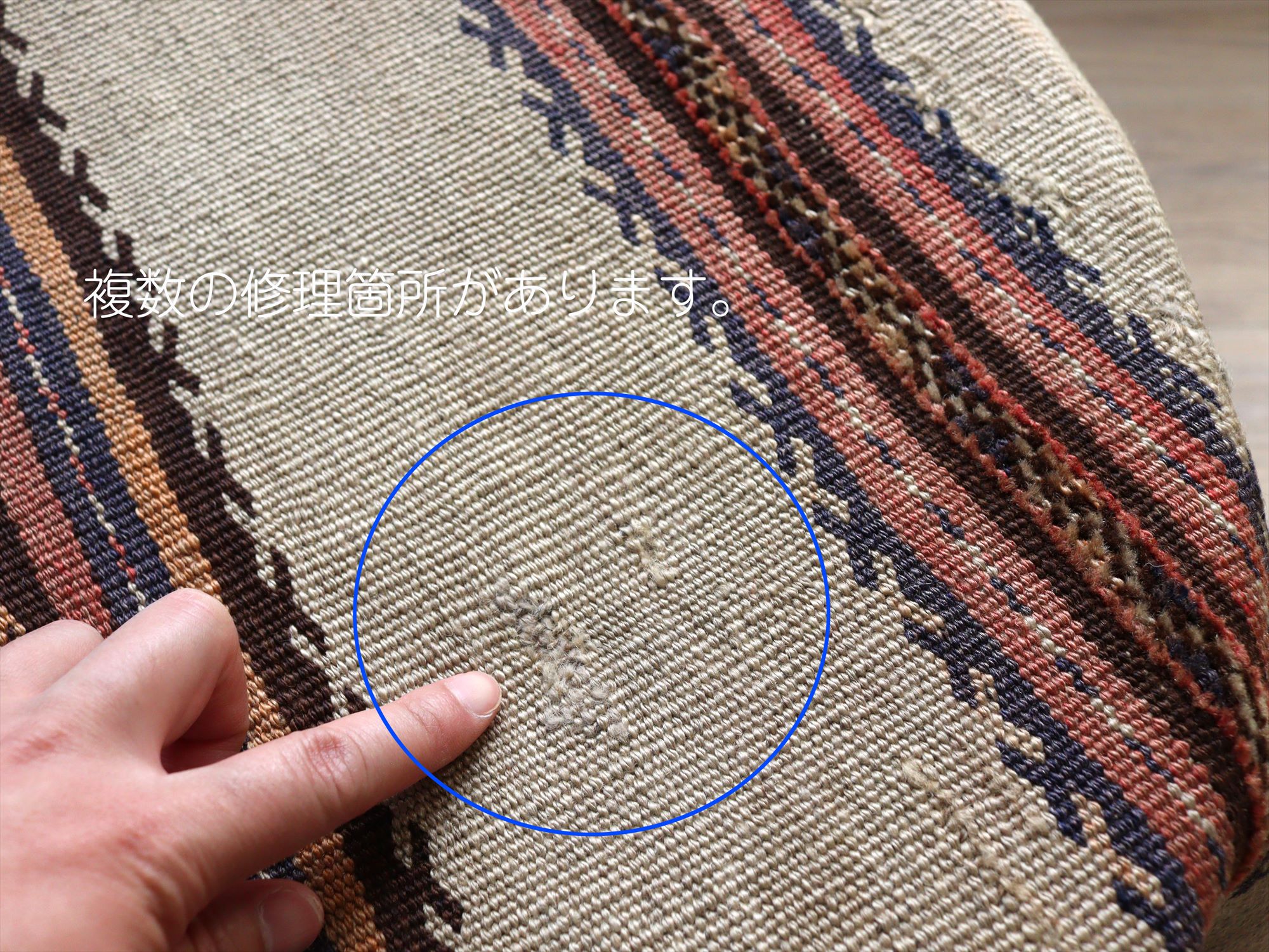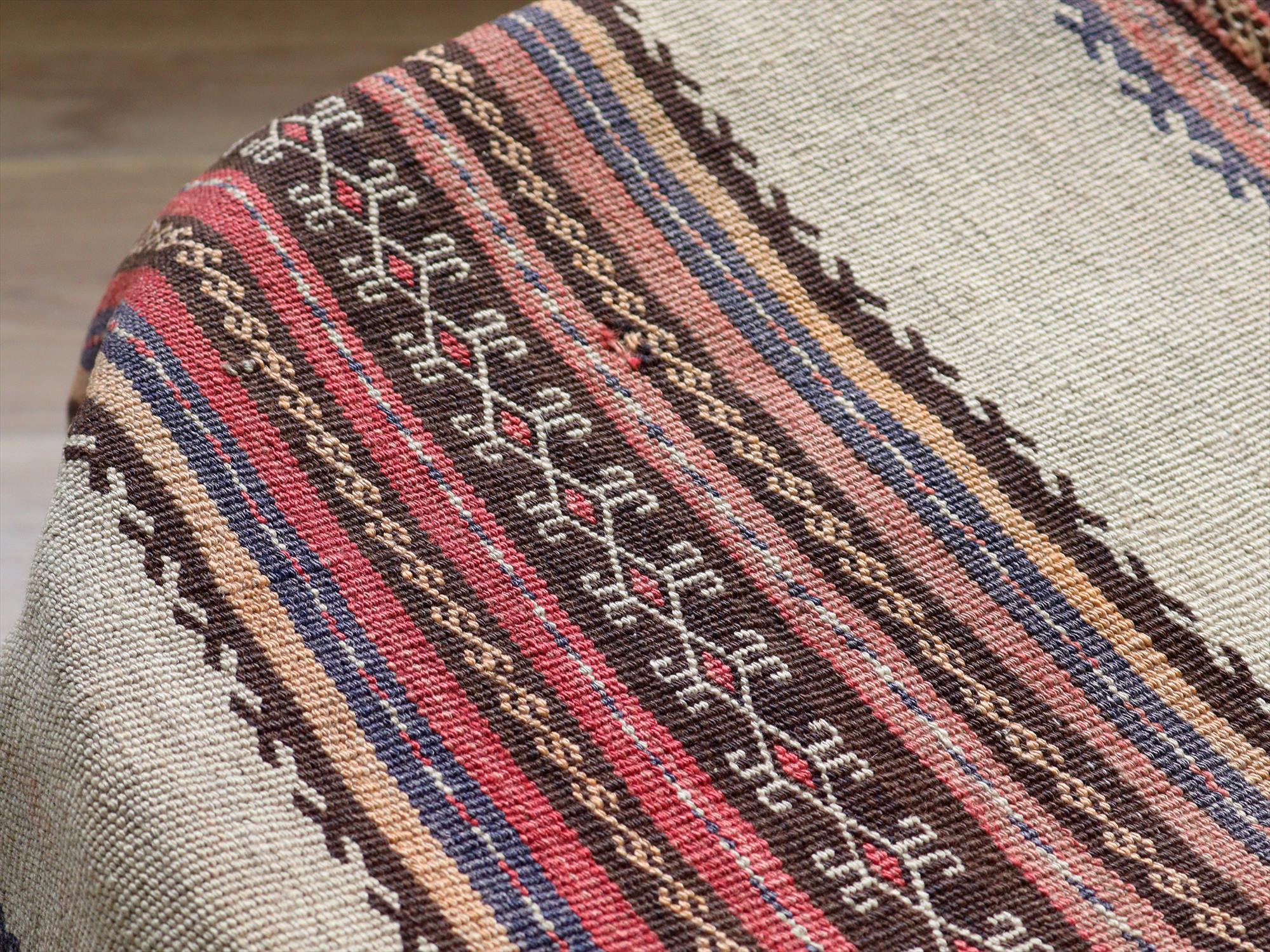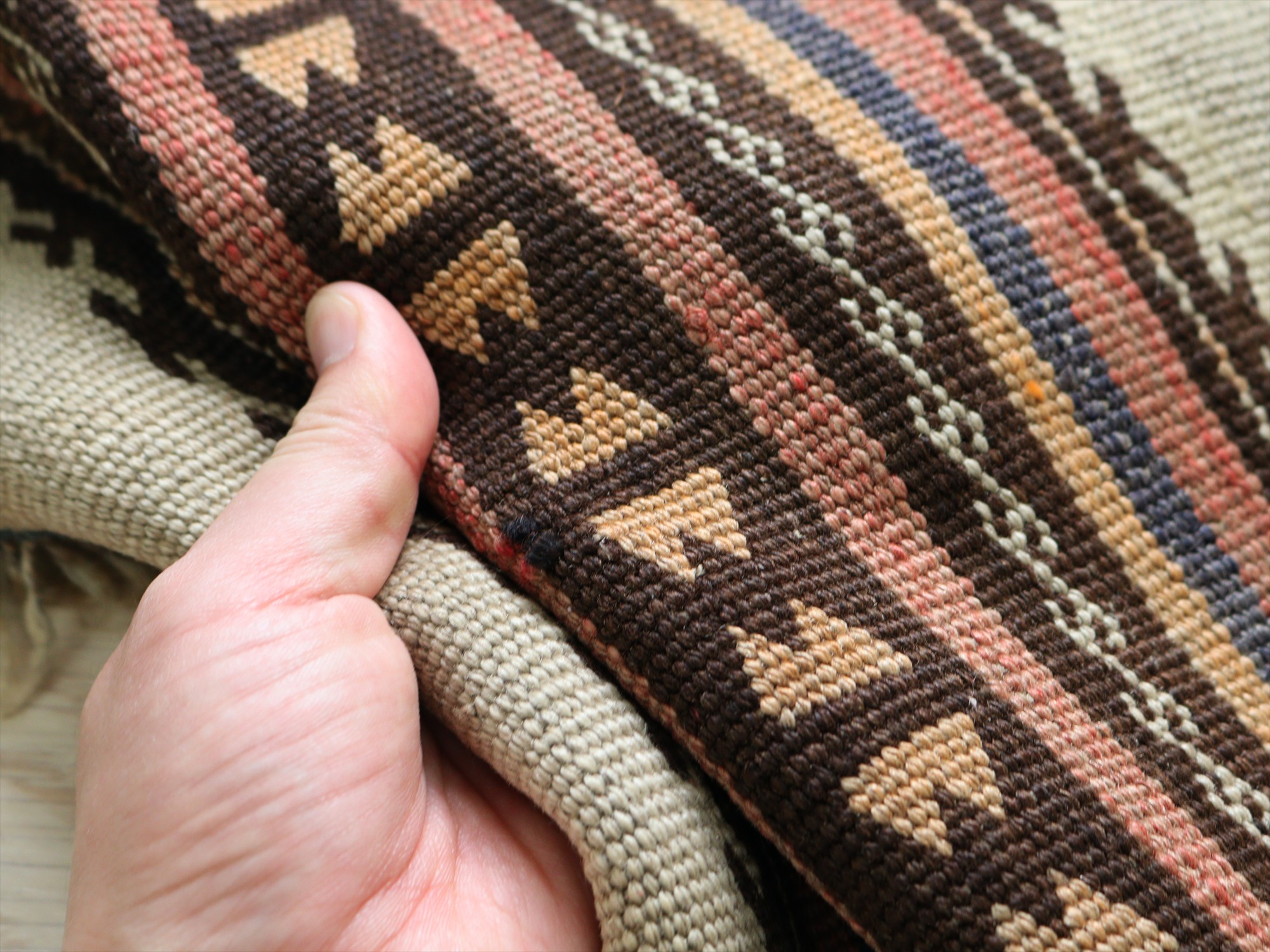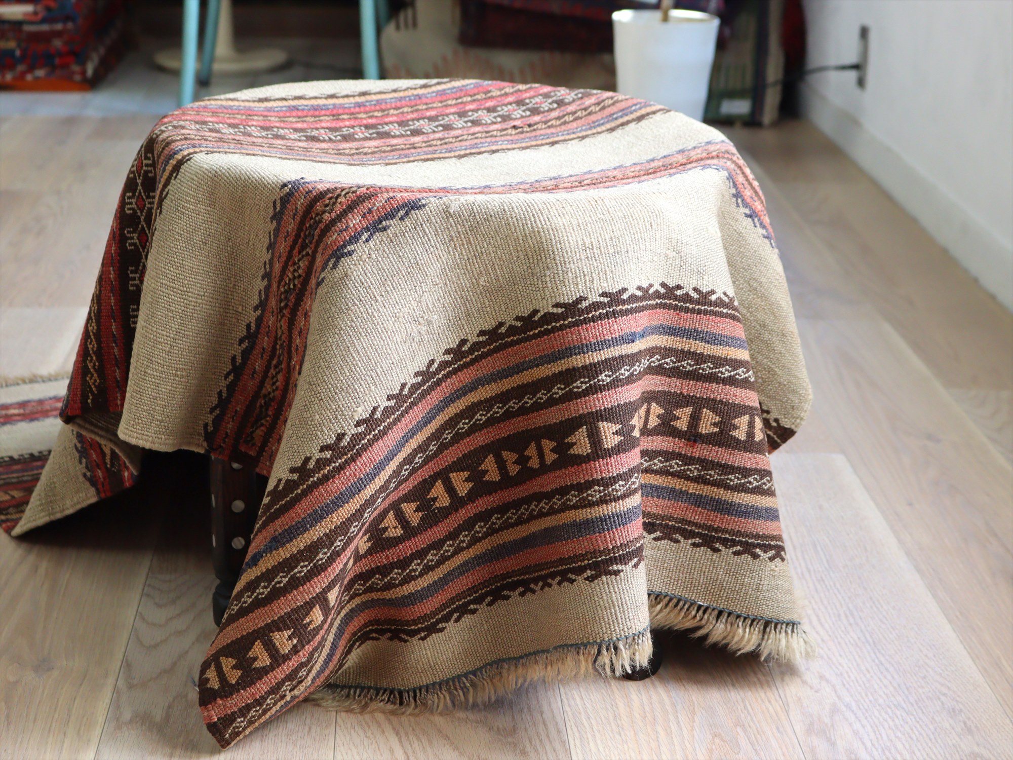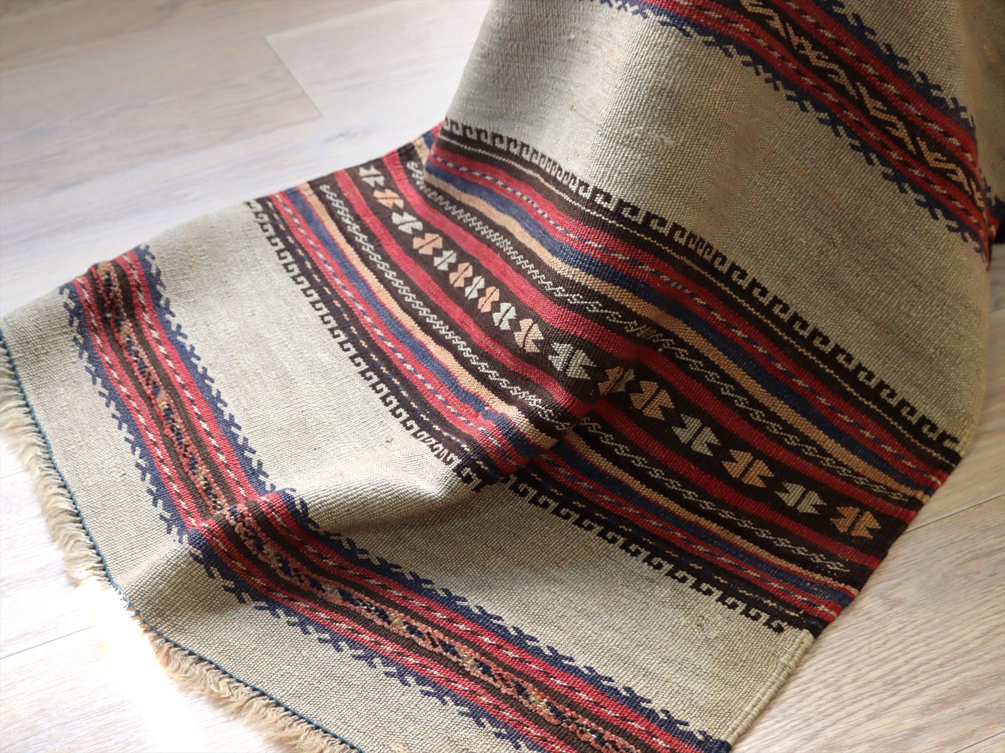 平織りとスザンニ織り、またパイル織りのミックスで織られたバルーチ族のキリムです。刺繍のように織られている部分は、スザンニ織りが成されていて、緻密で丁寧に幾何学模様が織られています。 |