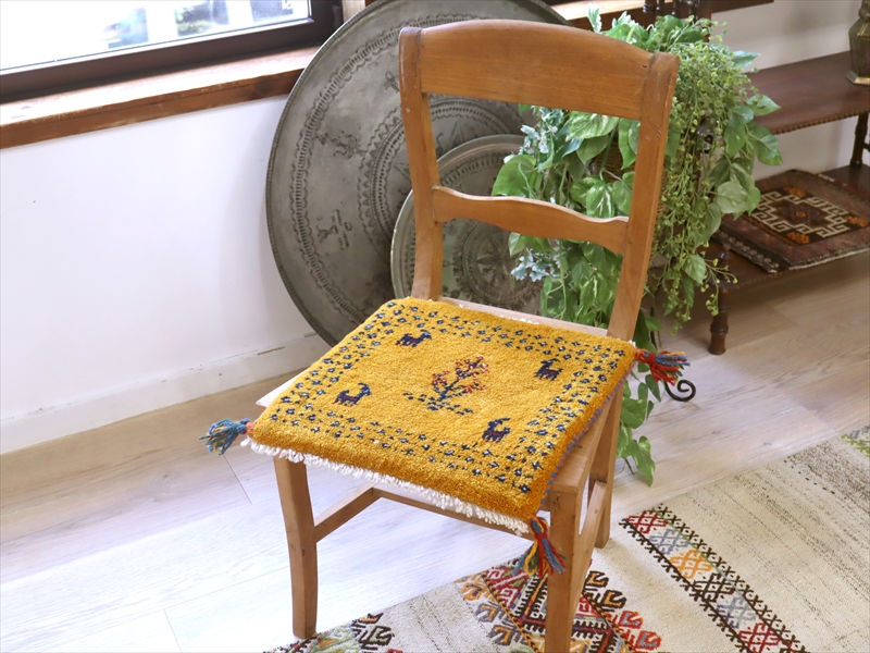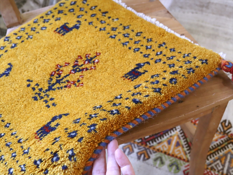 ギャッベ イラン産手織り 座布団サイズ 39x39cm イエローオレンジ