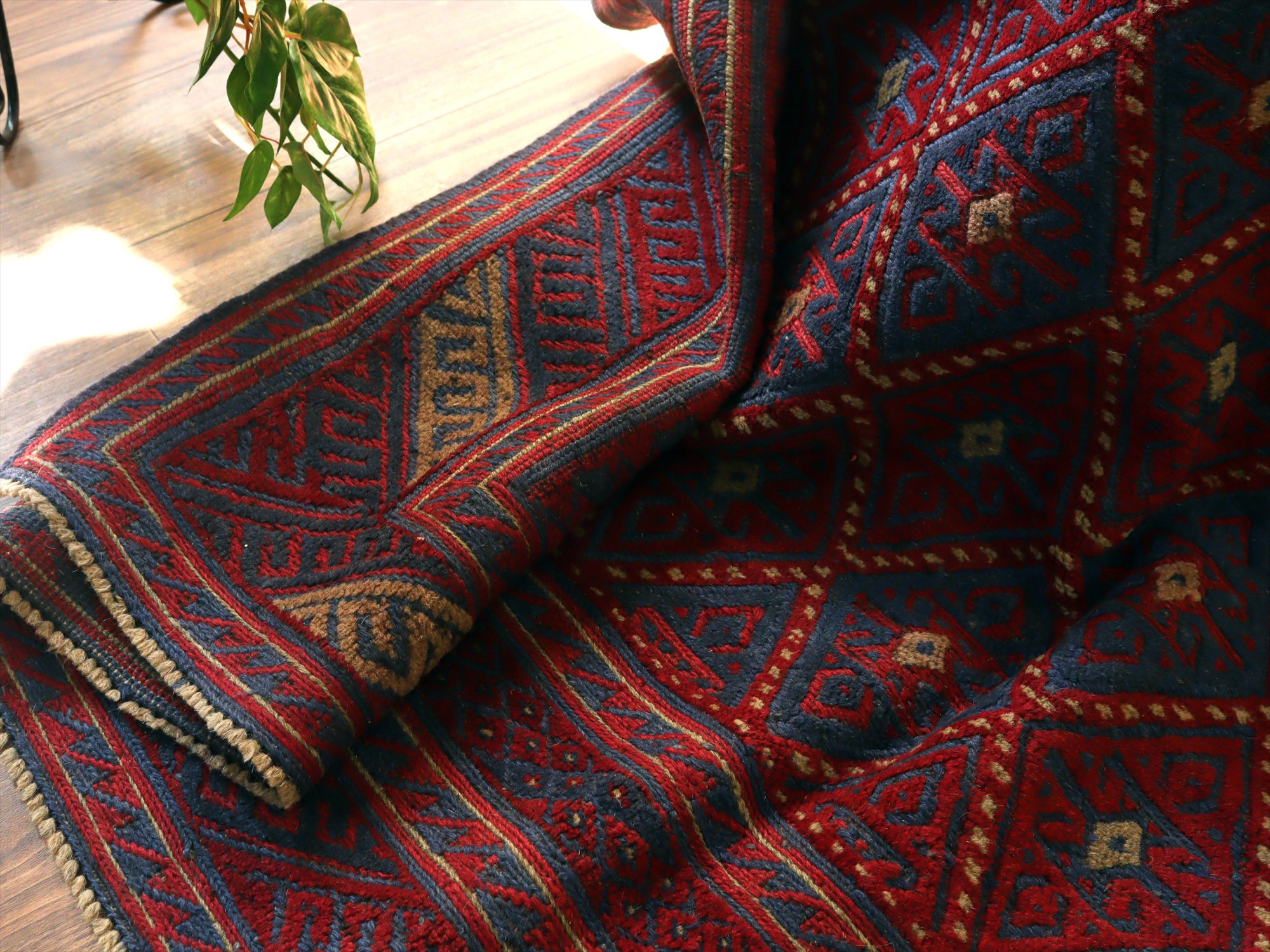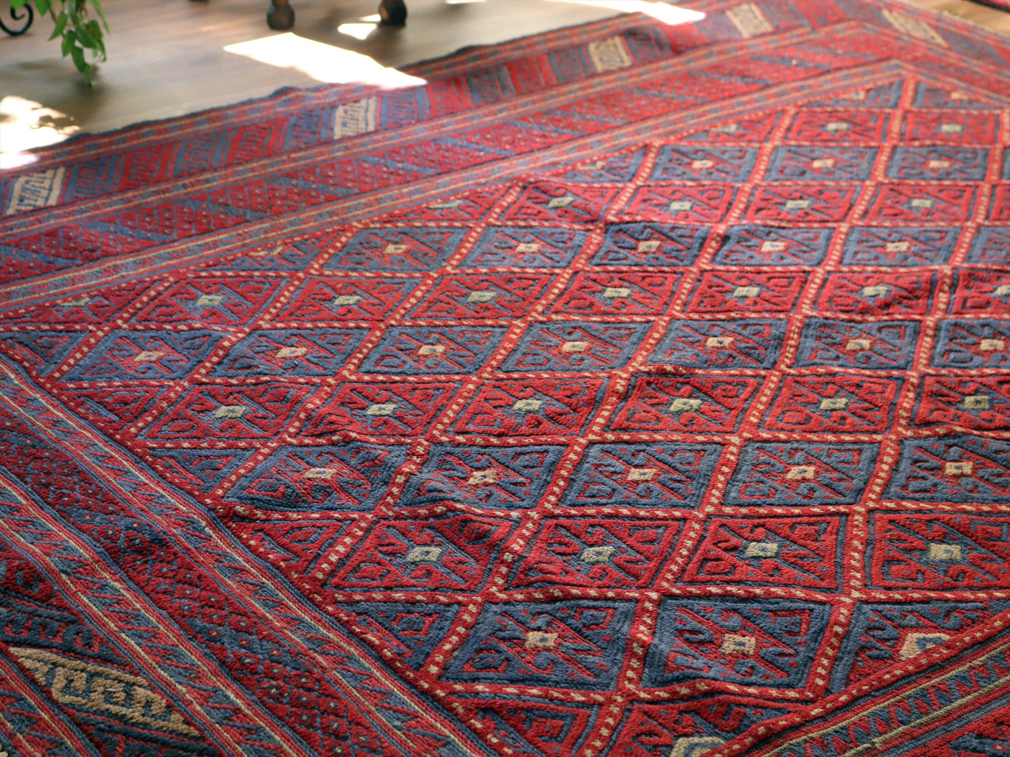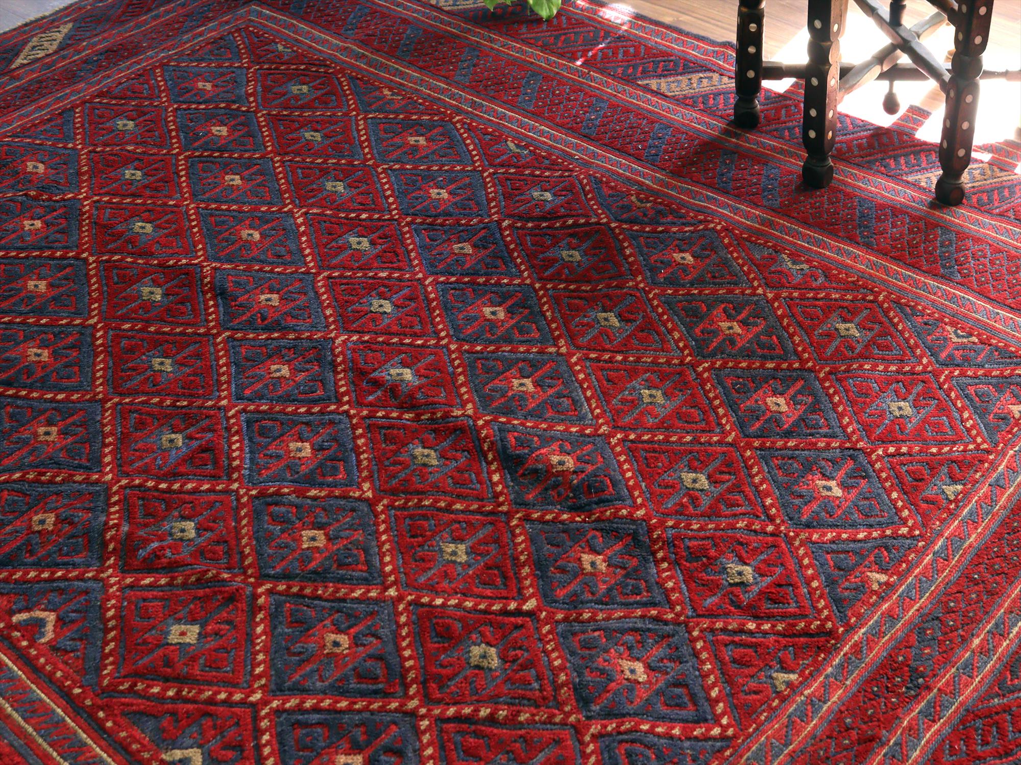 アフガニスタン東部、イランと国境を接するエリアの緻密な織りのキリムです。細かい織り目のスマック織りをベースに、立体感のあるカーペット織りでモチーフをレリーフのように織り込んだ1枚。 |