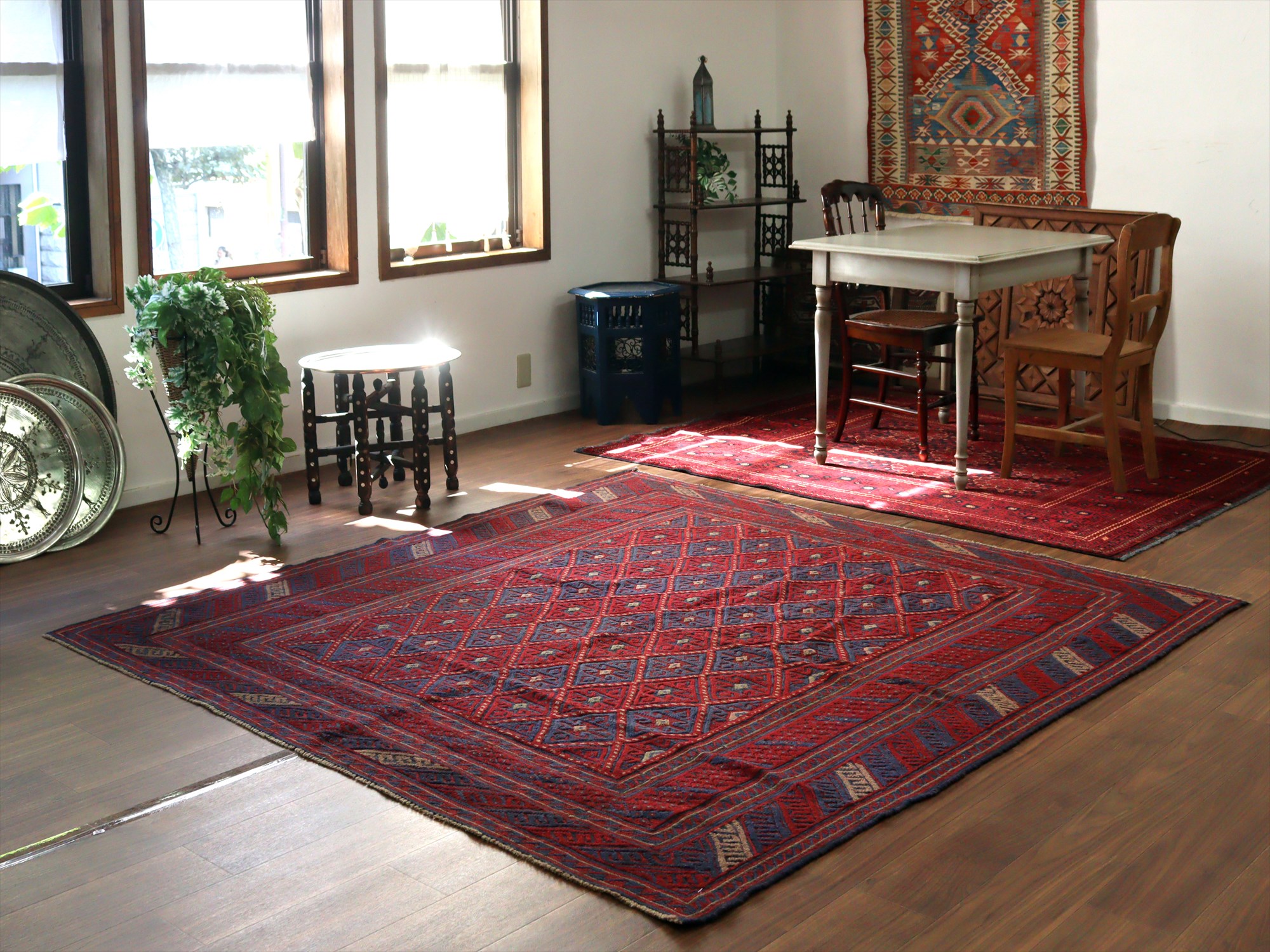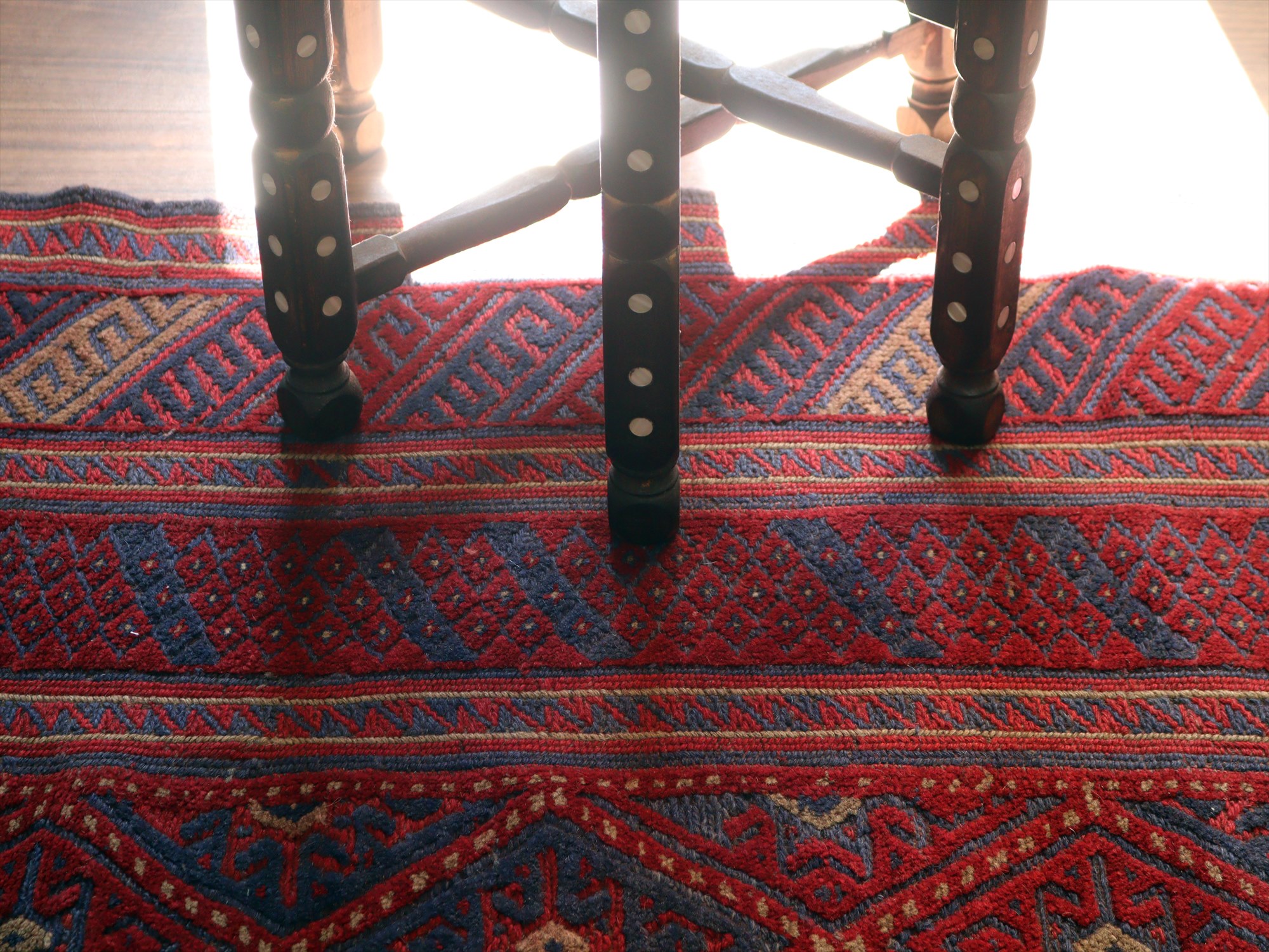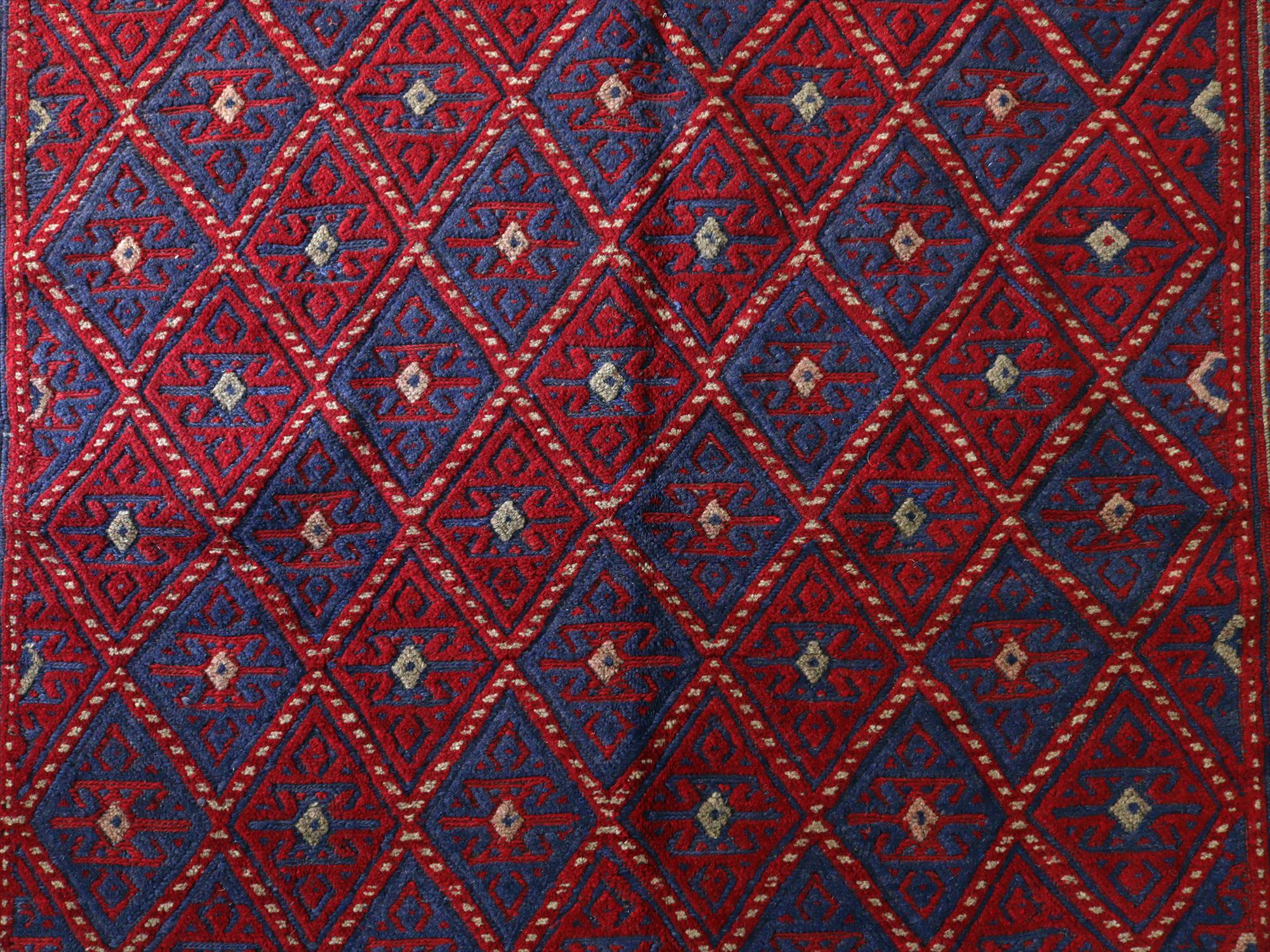 アフガニスタン東部、イランと国境を接するエリアの緻密な織りのキリムです。細かい織り目のスマック織りをベースに、立体感のあるカーペット織りでモチーフをレリーフのように織り込んだ1枚。 |