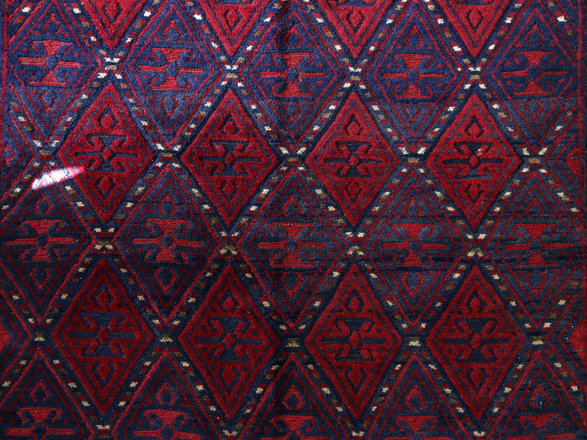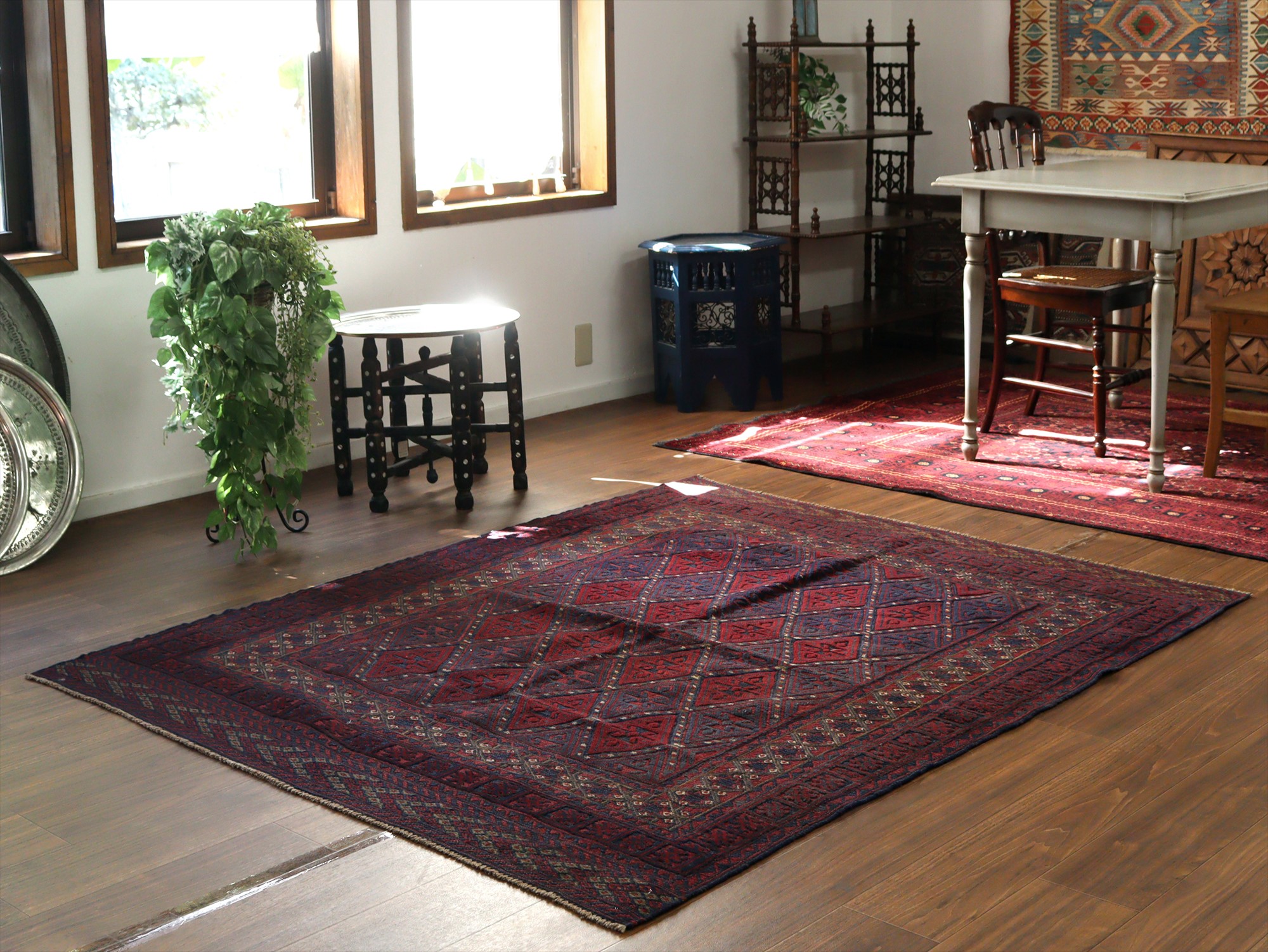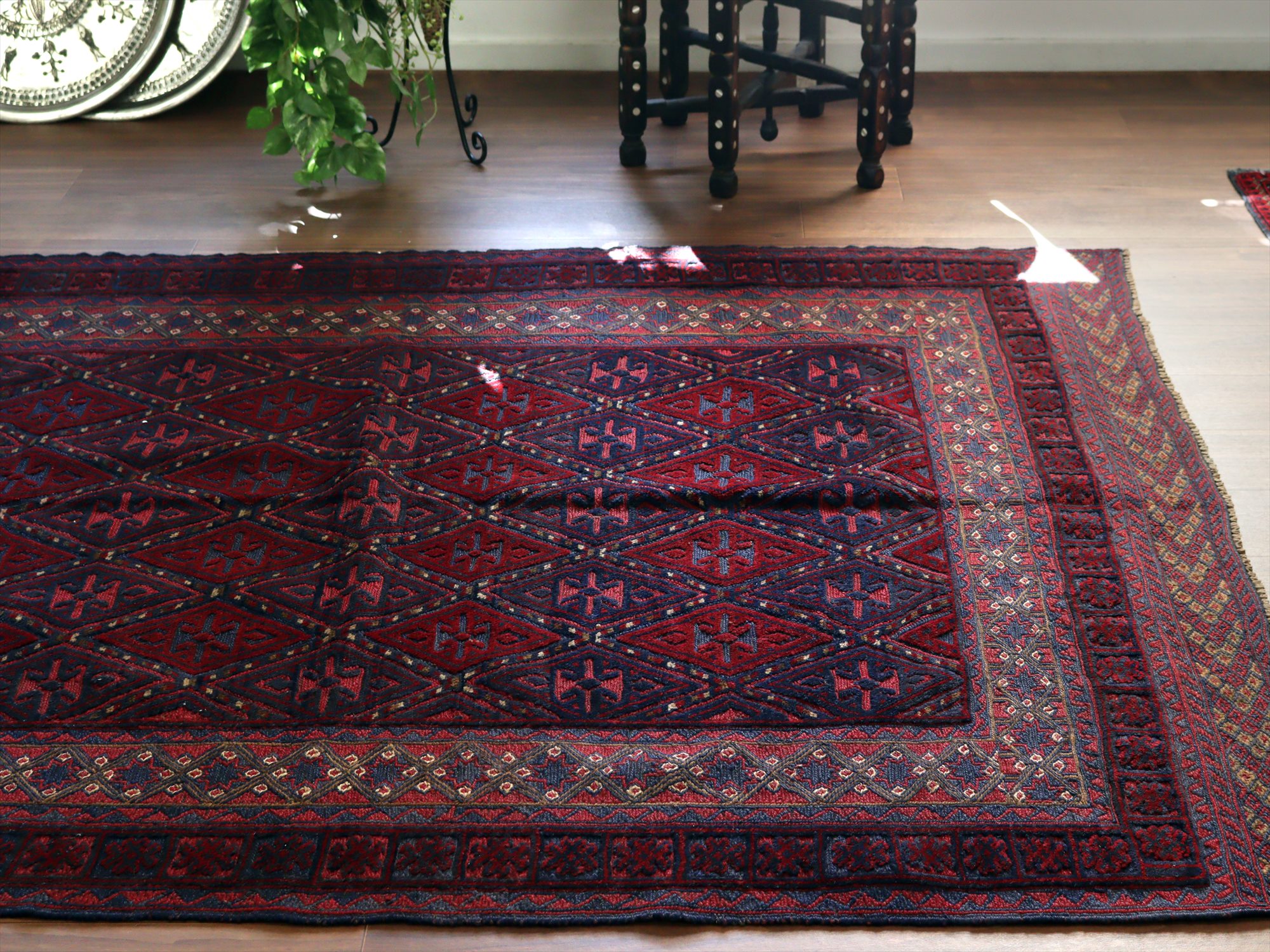 アフガニスタン東部、イランと国境を接するエリアの緻密な織りのキリムです。細かい織り目のスマック織りをベースに、立体感のあるカーペット織りでモチーフをレリーフのように織り込んだ1枚。 |