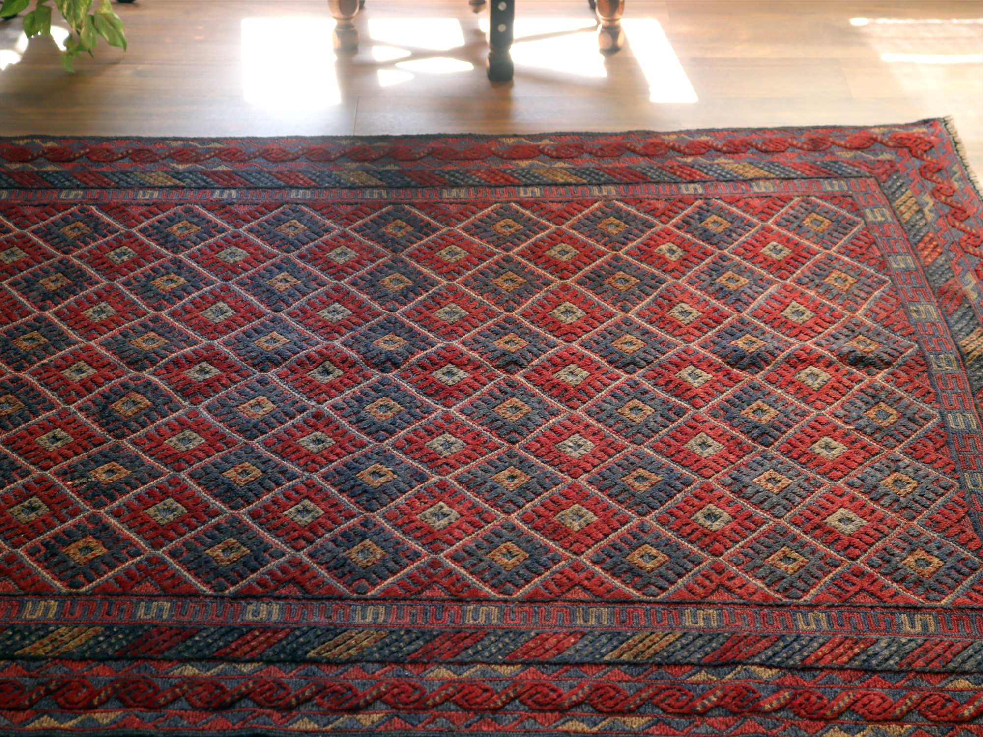アフガニスタン東部、イランと国境を接するエリアの緻密な織りのキリムです。細かい織り目のスマック織りをベースに、立体感のあるカーペット織りでモチーフをレリーフのように織り込んだ1枚。 |