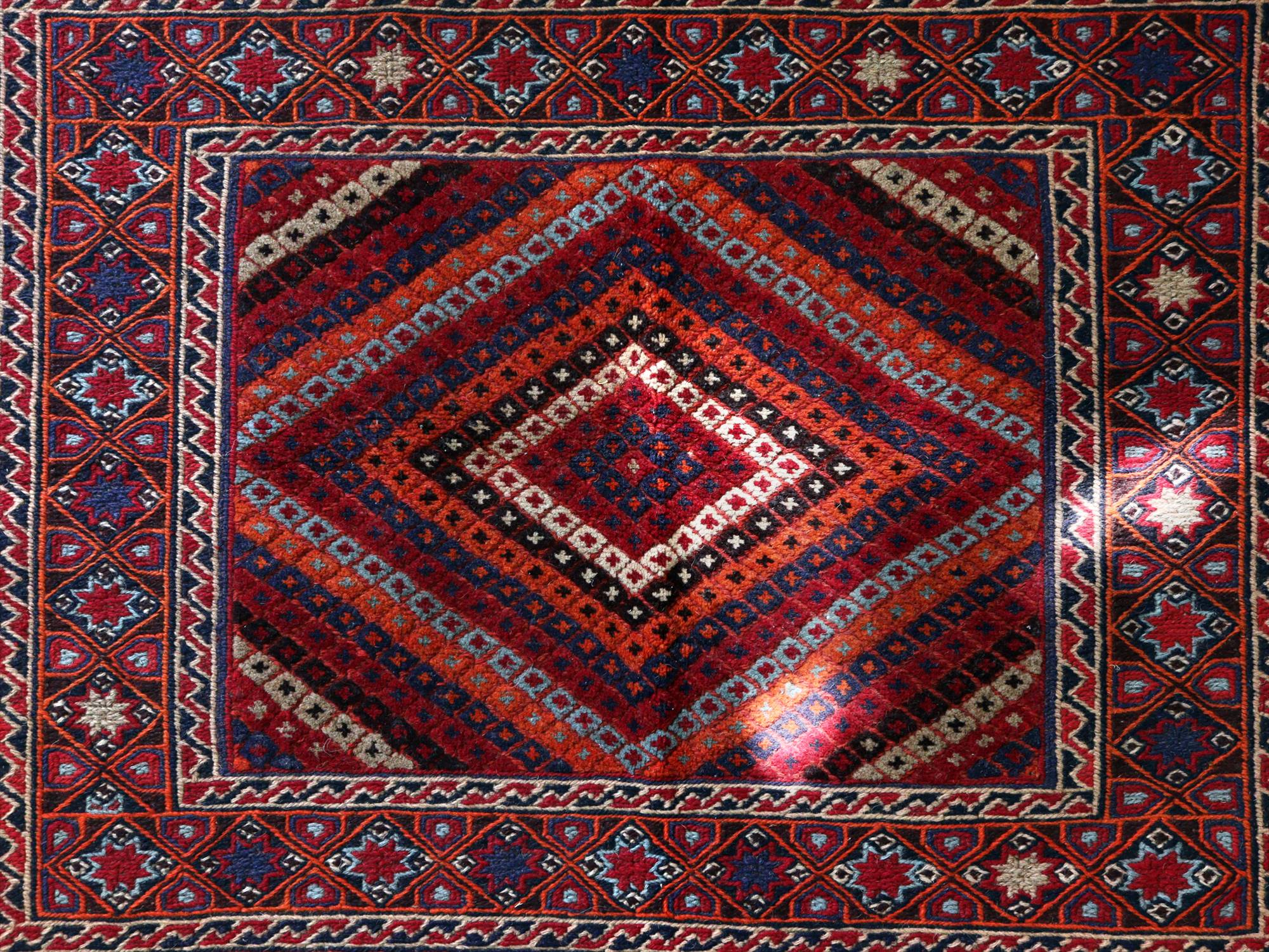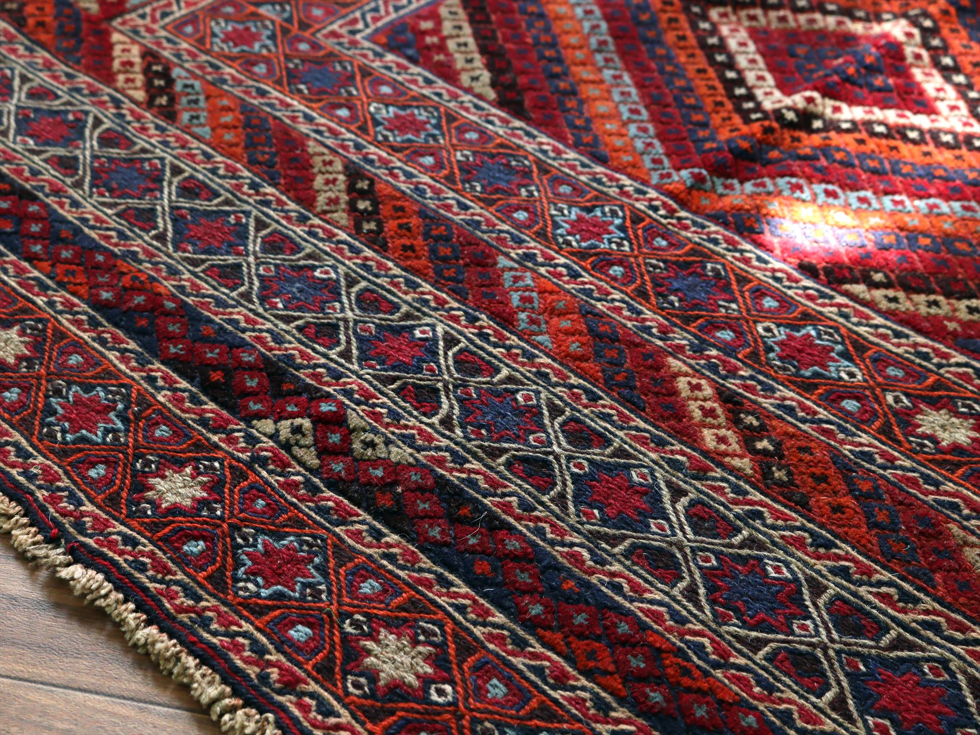 アフガニスタン東部、イランと国境を接するエリアの緻密な織りのキリムです。細かい織り目のスマック織りをベースに、立体感のあるカーペット織りでモチーフをレリーフのように織り込んだ1枚。 |