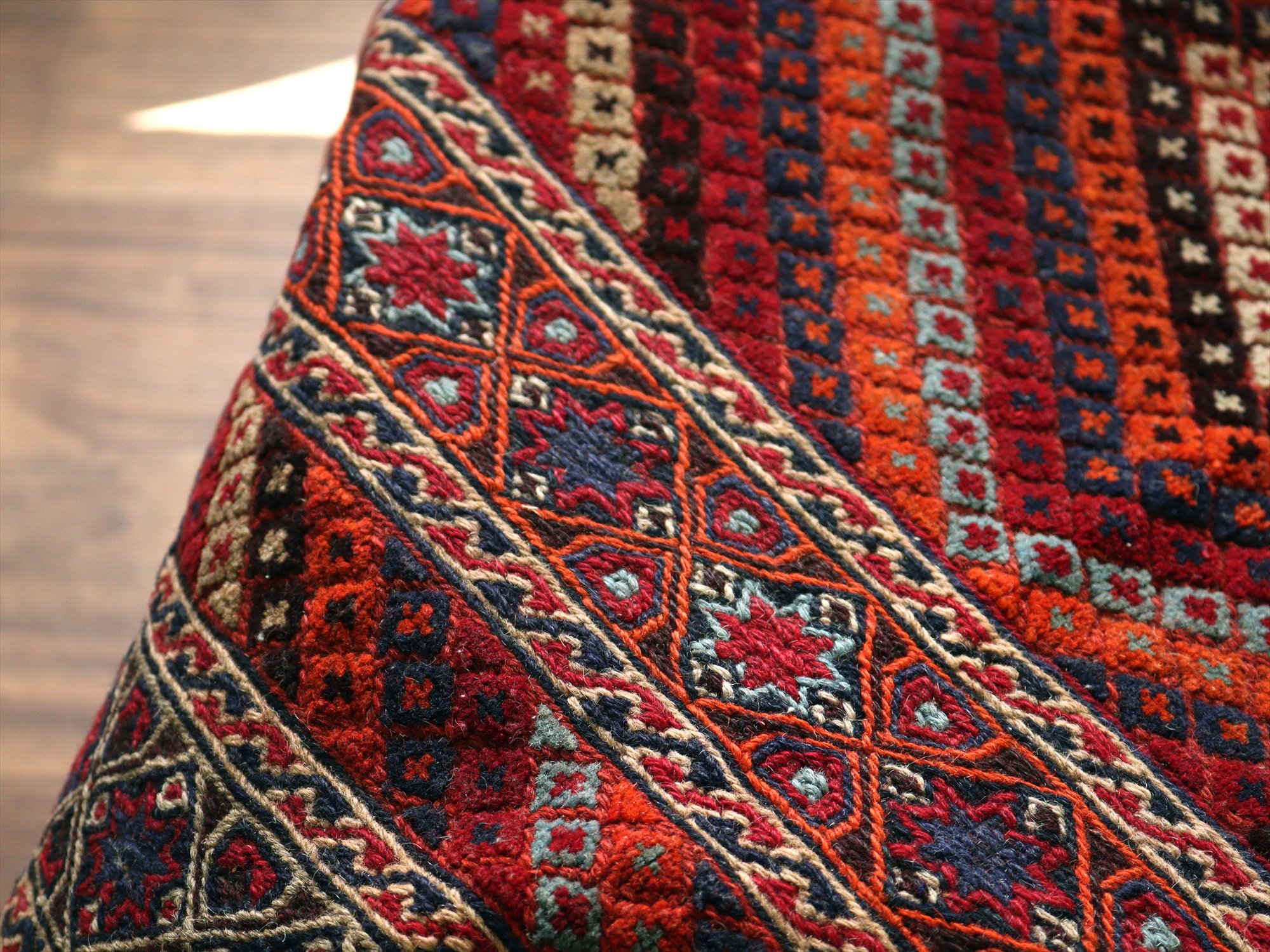 ベース地はスマック織りでしっかりとした織り地です。モチーフ部分はパイル(毛足)のある織りで、表面には立体感があります。 |