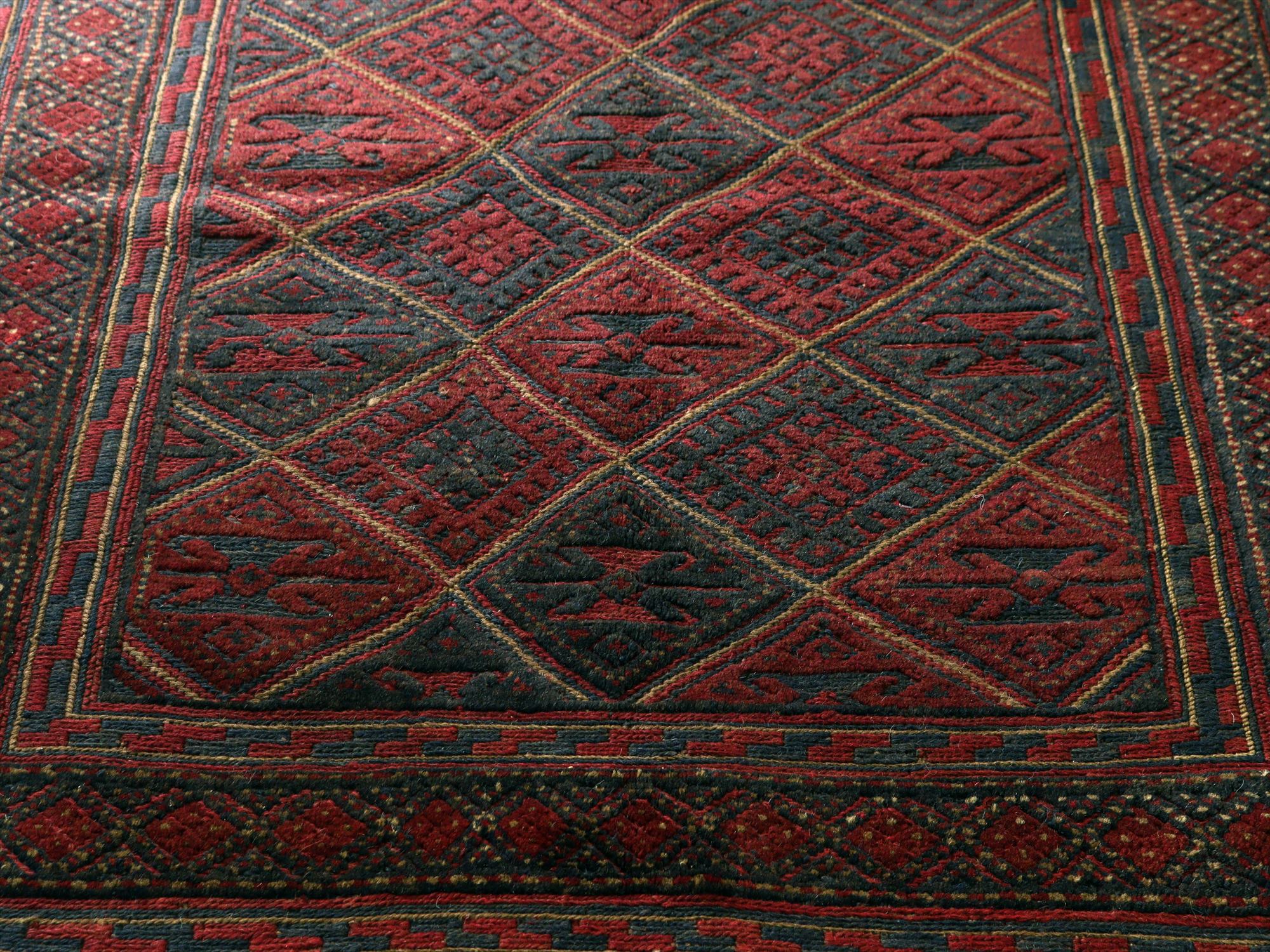 アフガニスタン東部、イランと国境を接するエリアの緻密な織りのキリムです。細かい織り目のスマック織りをベースに、立体感のあるカーペット織りでモチーフをレリーフのように織り込んだ1枚。 |