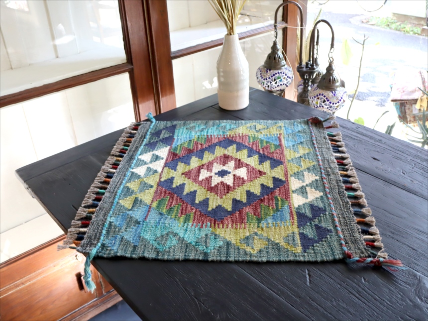 およそ50cm角のミニサイズの手織りキリムです。トルコ、イランの伝統的な幾何学モチーフを再現して、現在はアフガニスタンで織られています。ユニークなカラーコンビネーションには、織り手の自由なアイデアで織られるキリムらしさがでています。 |