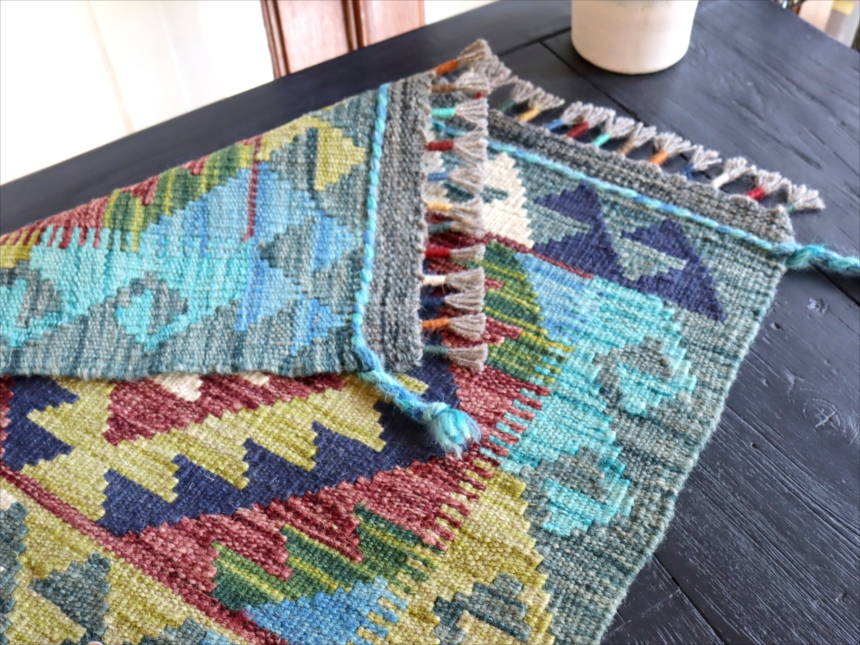 0.6-0.7mmほどの厚みのある平織りのキリムです。飾り糸がフリンジのようにのばしたままになっています。 |
