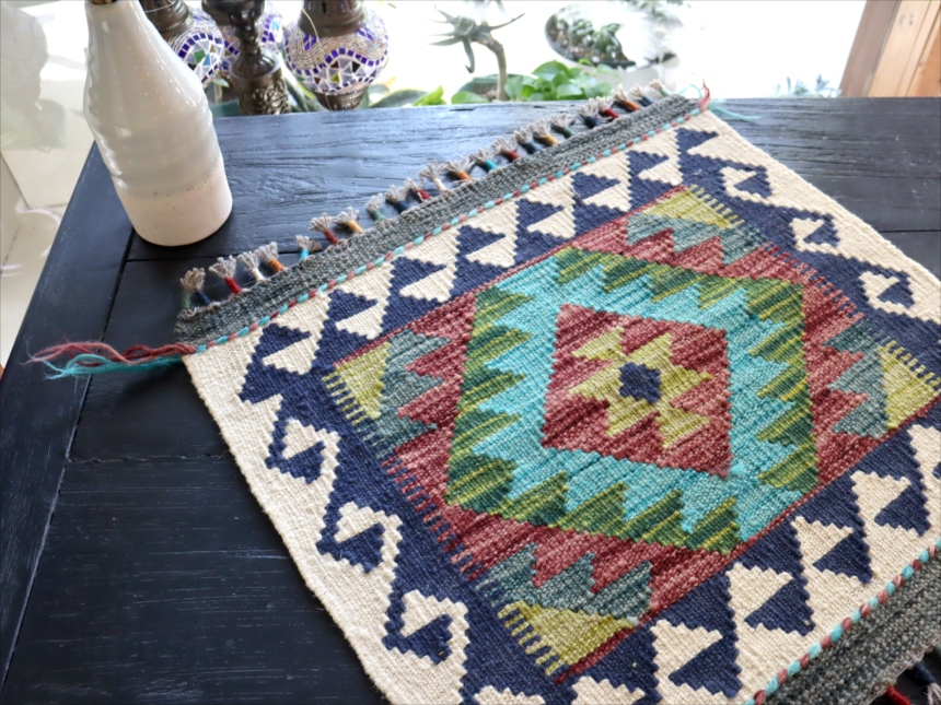 およそ50cm角のミニサイズの手織りキリムです。トルコ、イランの伝統的な幾何学モチーフを再現して、現在はアフガニスタンで織られています。ユニークなカラーコンビネーションには、織り手の自由なアイデアで織られるキリムらしさがでています。 |
