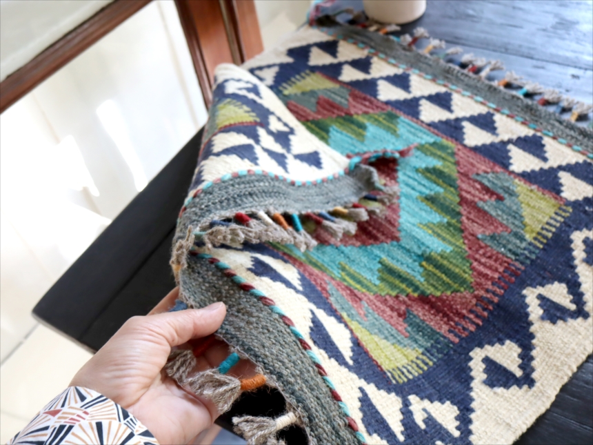 0.6-0.7mmほどの厚みのある平織りのキリムです。飾り糸がフリンジのようにのばしたままになっています。 |