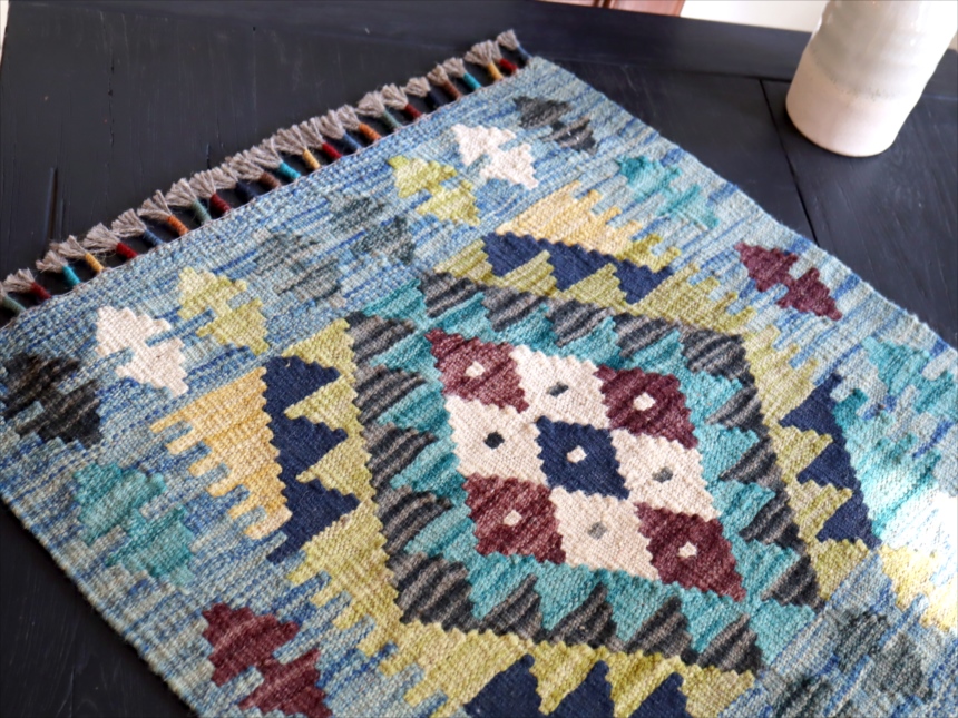 およそ50cm角のミニサイズの手織りキリムです。トルコ、イランの伝統的な幾何学モチーフを再現して、現在はアフガニスタンで織られています。ユニークなカラーコンビネーションには、織り手の自由なアイデアで織られるキリムらしさがでています。 |