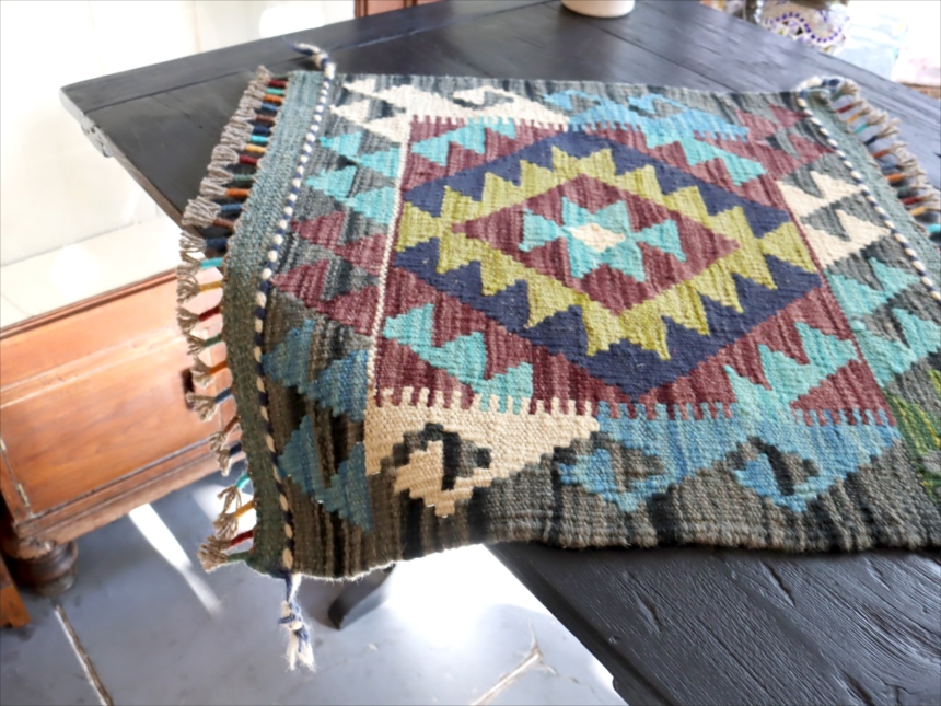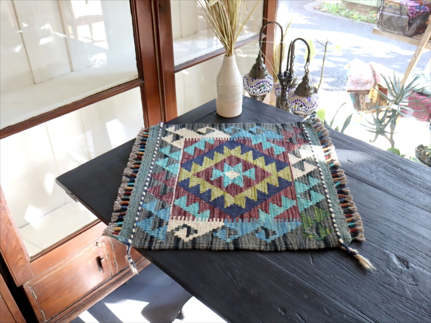 およそ50cm角のミニサイズの手織りキリムです。トルコ、イランの伝統的な幾何学モチーフを再現して、現在はアフガニスタンで織られています。ユニークなカラーコンビネーションには、織り手の自由なアイデアで織られるキリムらしさがでています。 |