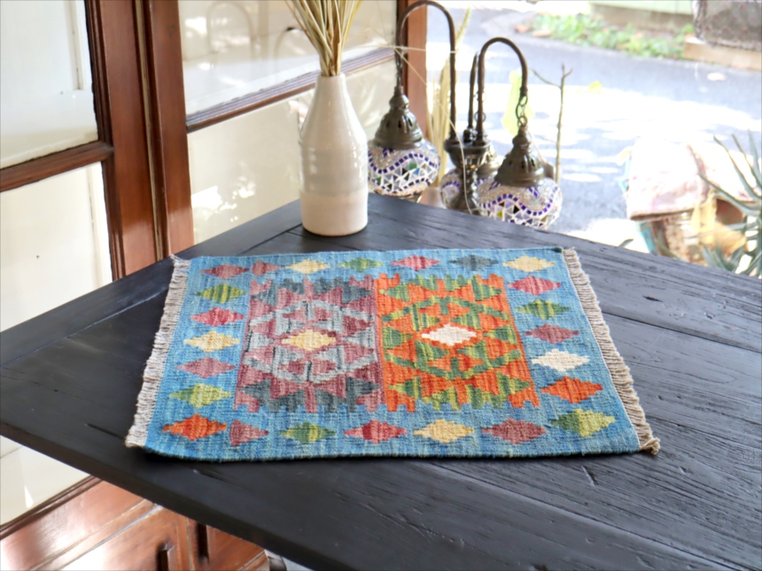 およそ50cm角のミニサイズの手織りキリムです。トルコ、イランの伝統的な幾何学モチーフを再現して、現在はアフガニスタンで織られています。ユニークなカラーコンビネーションには、織り手の自由なアイデアで織られるキリムらしさがでています。 |