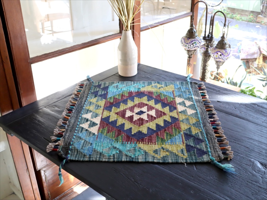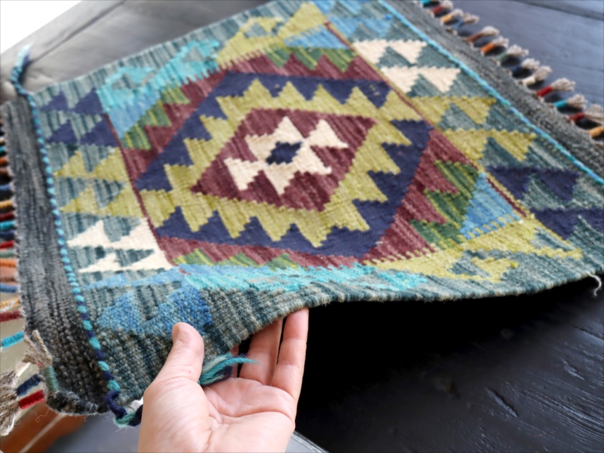 およそ50cm角のミニサイズの手織りキリムです。トルコ、イランの伝統的な幾何学モチーフを再現して、現在はアフガニスタンで織られています。ユニークなカラーコンビネーションには、織り手の自由なアイデアで織られるキリムらしさがでています。 |