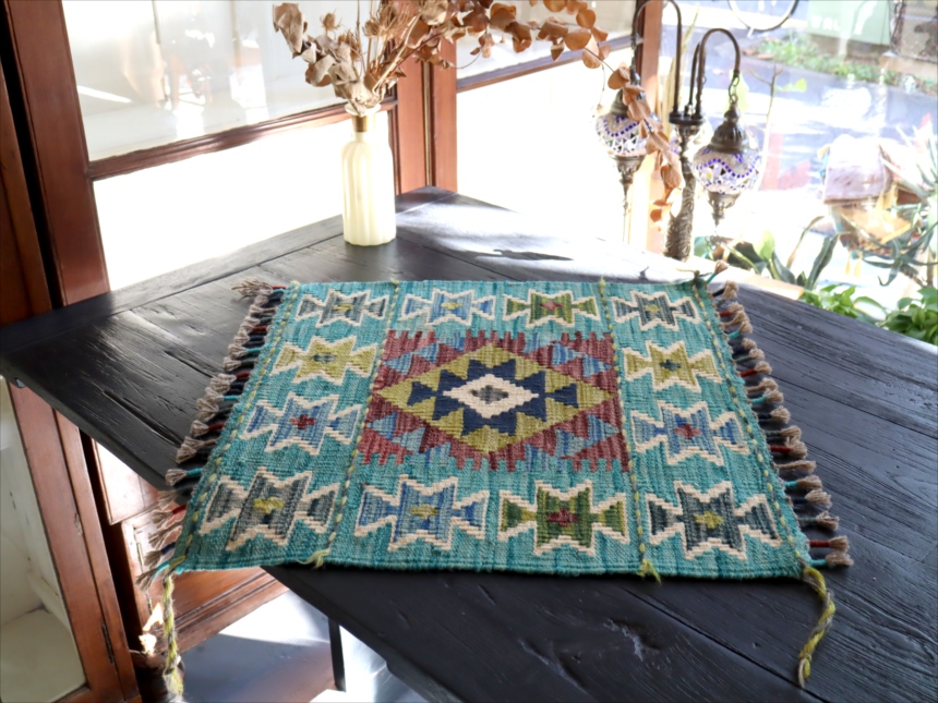 およそ50cm角のミニサイズの手織りキリムです。トルコ、イランの伝統的な幾何学モチーフを再現して、現在はアフガニスタンで織られています。ユニークなカラーコンビネーションには、織り手の自由なアイデアで織られるキリムらしさがでています。 |