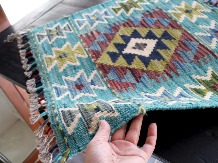 0.6-0.7mmほどの厚みのある平織りのキリムです。飾り糸がフリンジのようにのばしたままになっています。 |