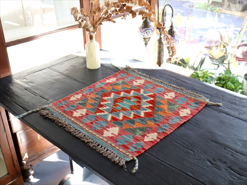 およそ50cm角のミニサイズの手織りキリムです。トルコ、イランの伝統的な幾何学モチーフを再現して、現在はアフガニスタンで織られています。ユニークなカラーコンビネーションには、織り手の自由なアイデアで織られるキリムらしさがでています。 |