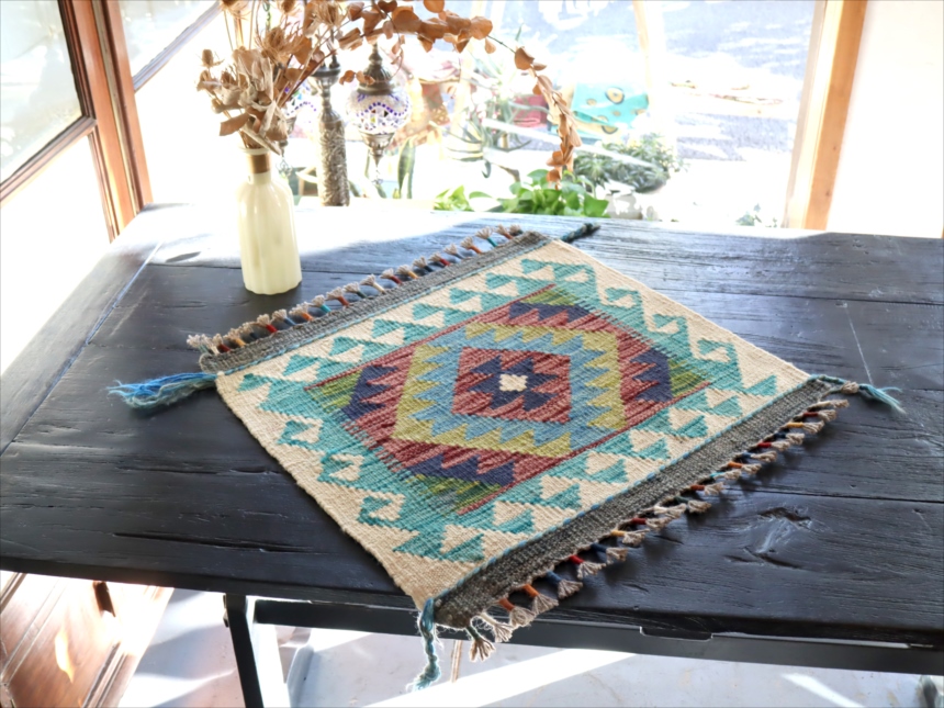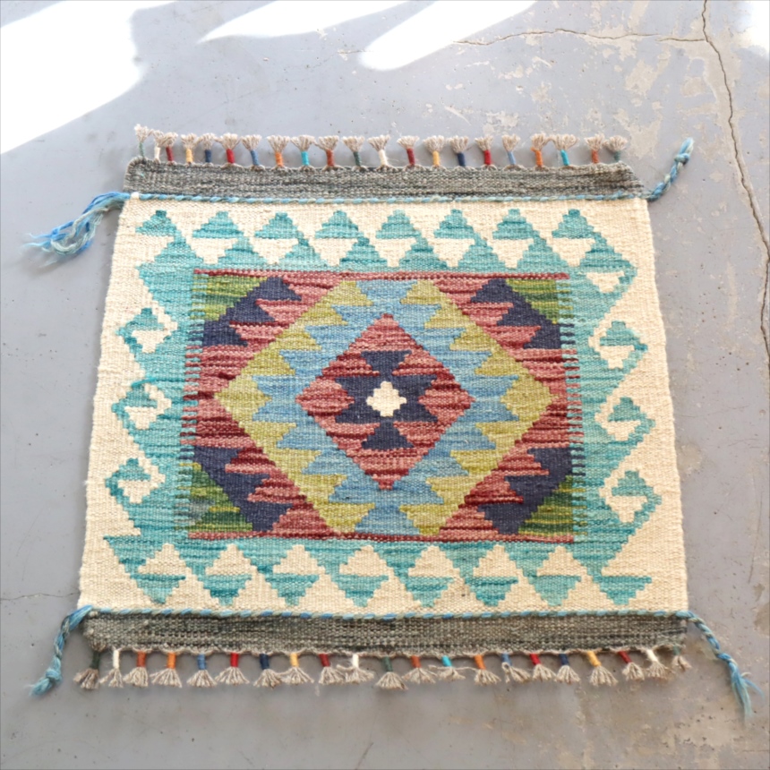 およそ50cm角のミニサイズの手織りキリムです。トルコ、イランの伝統的な幾何学モチーフを再現して、現在はアフガニスタンで織られています。ユニークなカラーコンビネーションには、織り手の自由なアイデアで織られるキリムらしさがでています。 |