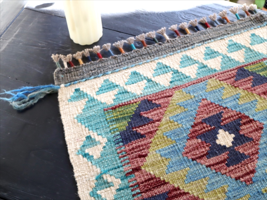 0.6-0.7mmほどの厚みのある平織りのキリムです。飾り糸がフリンジのようにのばしたままになっています。 |
