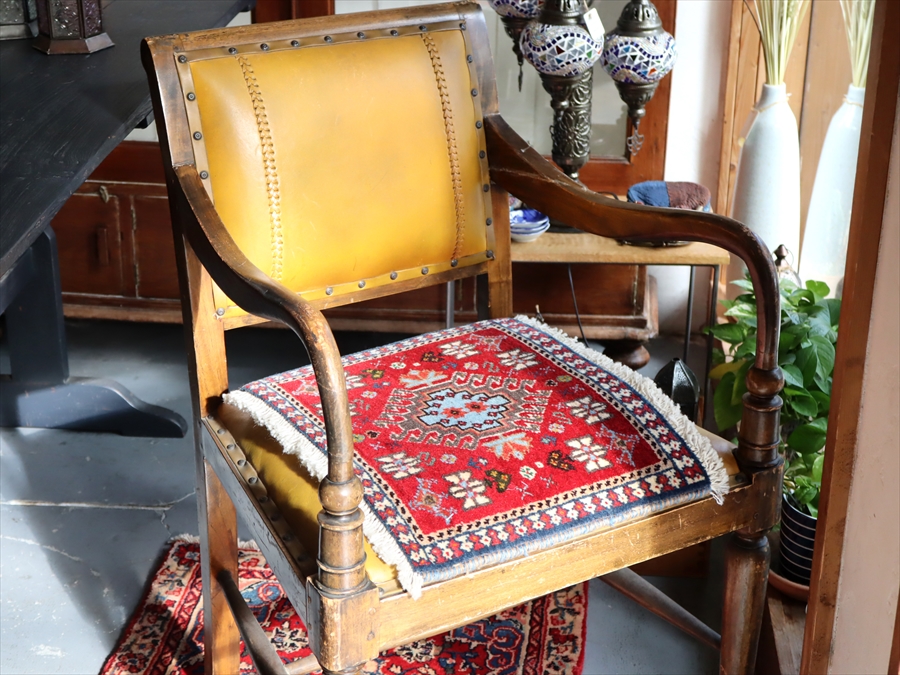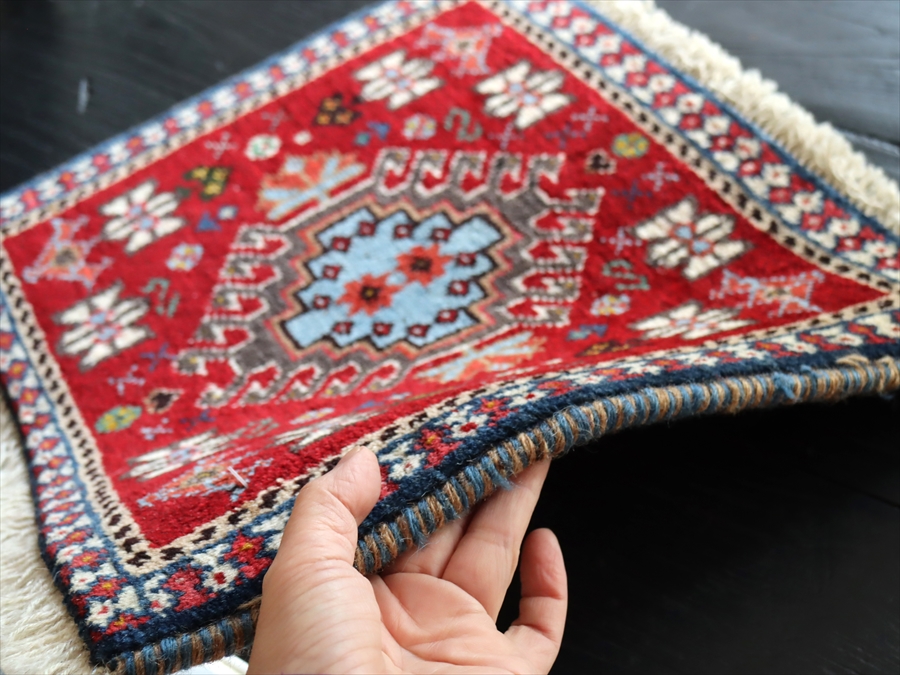 | 30cm角のミニサイズのラグ。小さいながらも、織りはしっかりしていて本格的です。多少ゆがみが気になりますが、ゆがみも含めて素朴な感じをお楽しみいただければと思います。 |