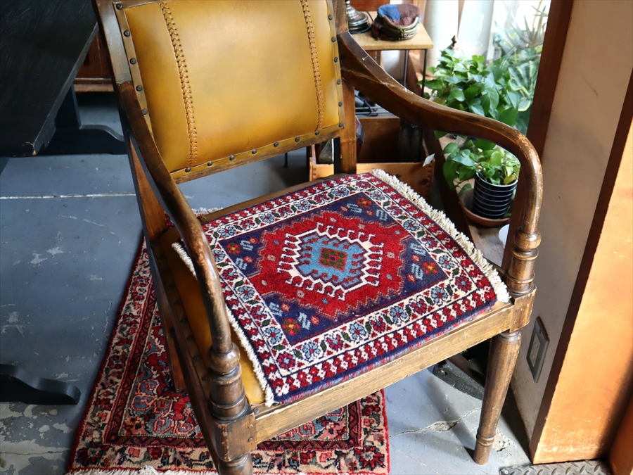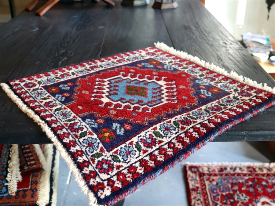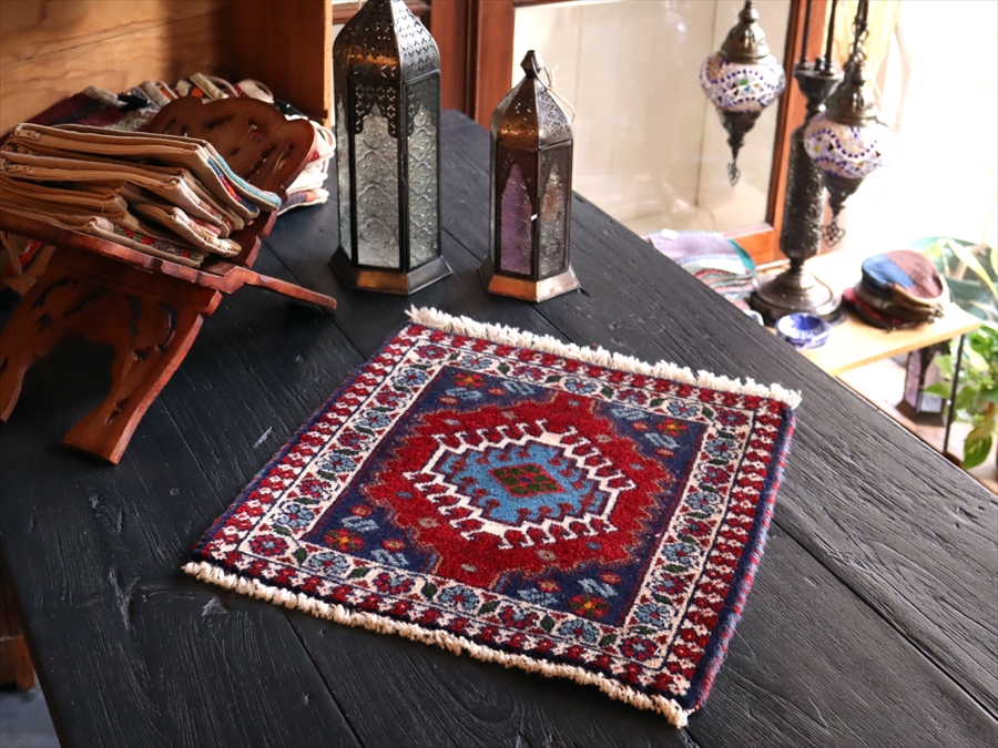 | 30cm角のミニサイズのラグ。小さいながらも、織りはしっかりしていて本格的です。多少ゆがみが気になりますが、ゆがみも含めて素朴な感じをお楽しみいただければと思います。 |
