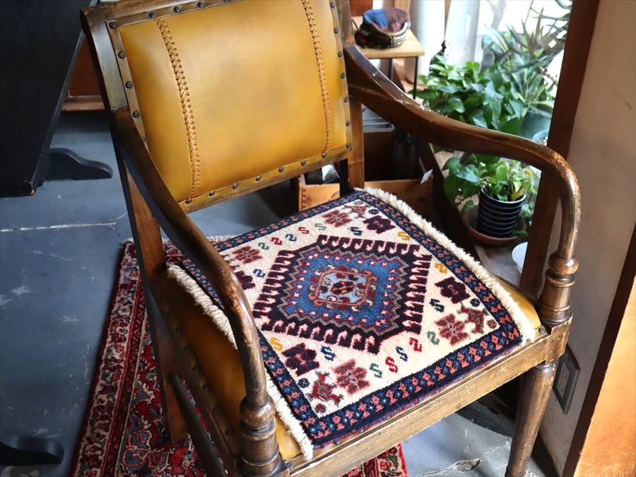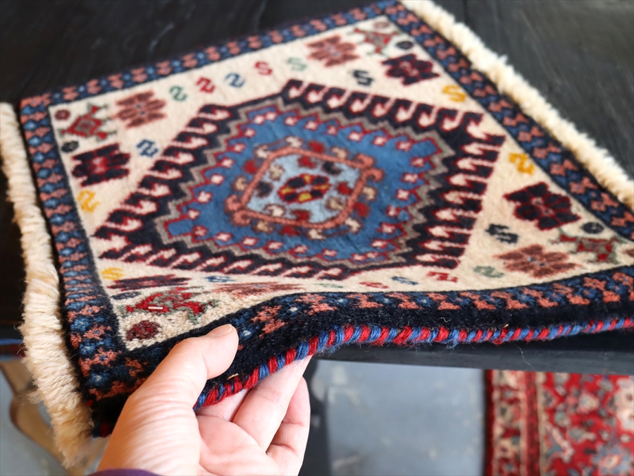 | 30cm角のミニサイズのラグ。小さいながらも、織りはしっかりしていて本格的です。多少ゆがみが気になりますが、ゆがみも含めて素朴な感じをお楽しみいただければと思います。 |