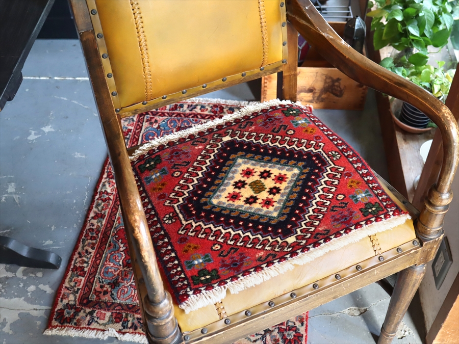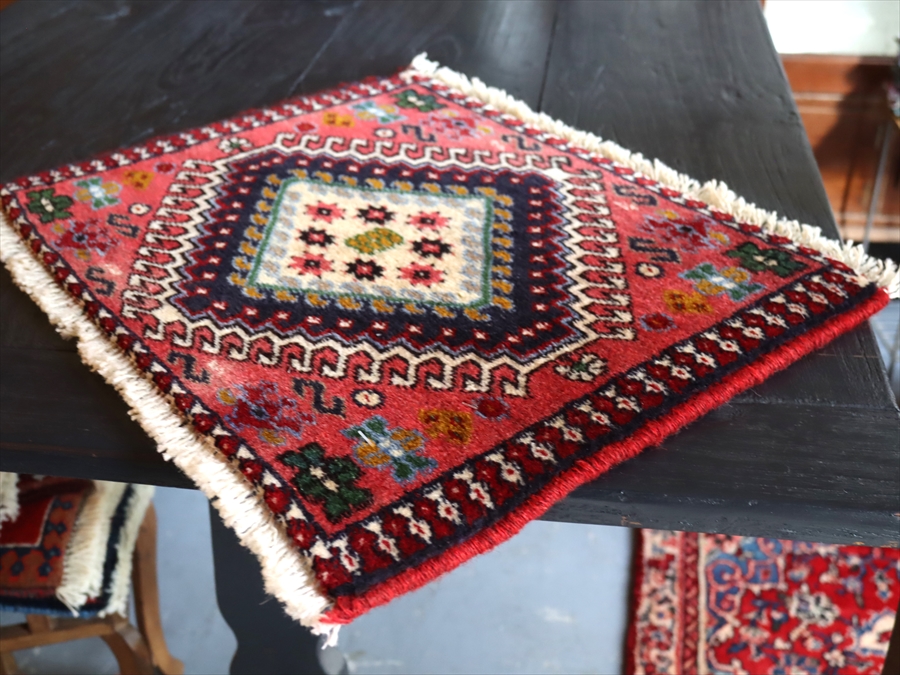 | 30cm角のミニサイズのラグ。小さいながらも、織りはしっかりしていて本格的です。多少ゆがみが気になりますが、ゆがみも含めて素朴な感じをお楽しみいただければと思います。 |