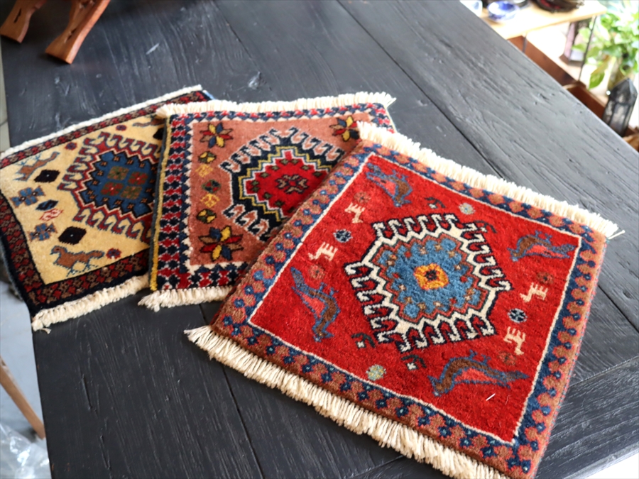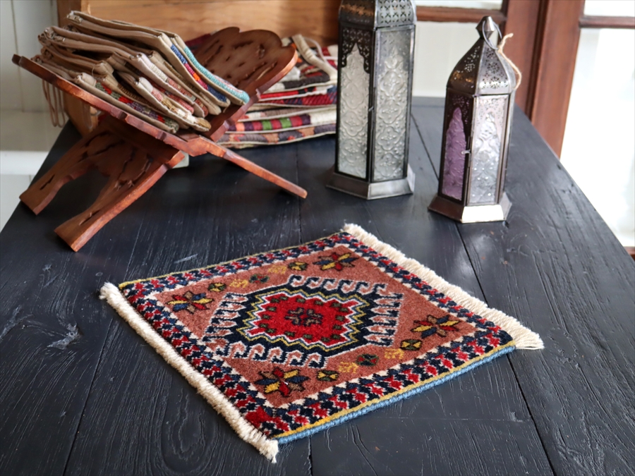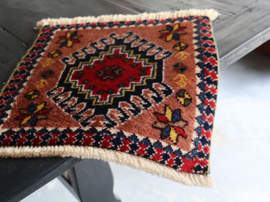 | 30cm角のミニサイズのラグ。小さいながらも、織りはしっかりしていて本格的です。多少ゆがみが気になりますが、ゆがみも含めて素朴な感じをお楽しみいただければと思います。 |