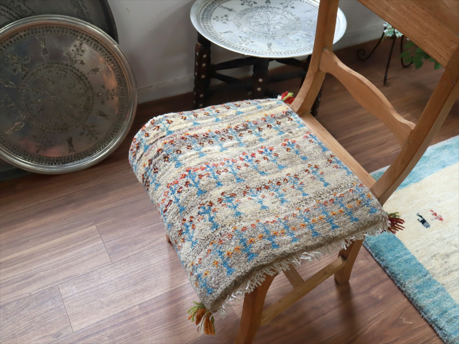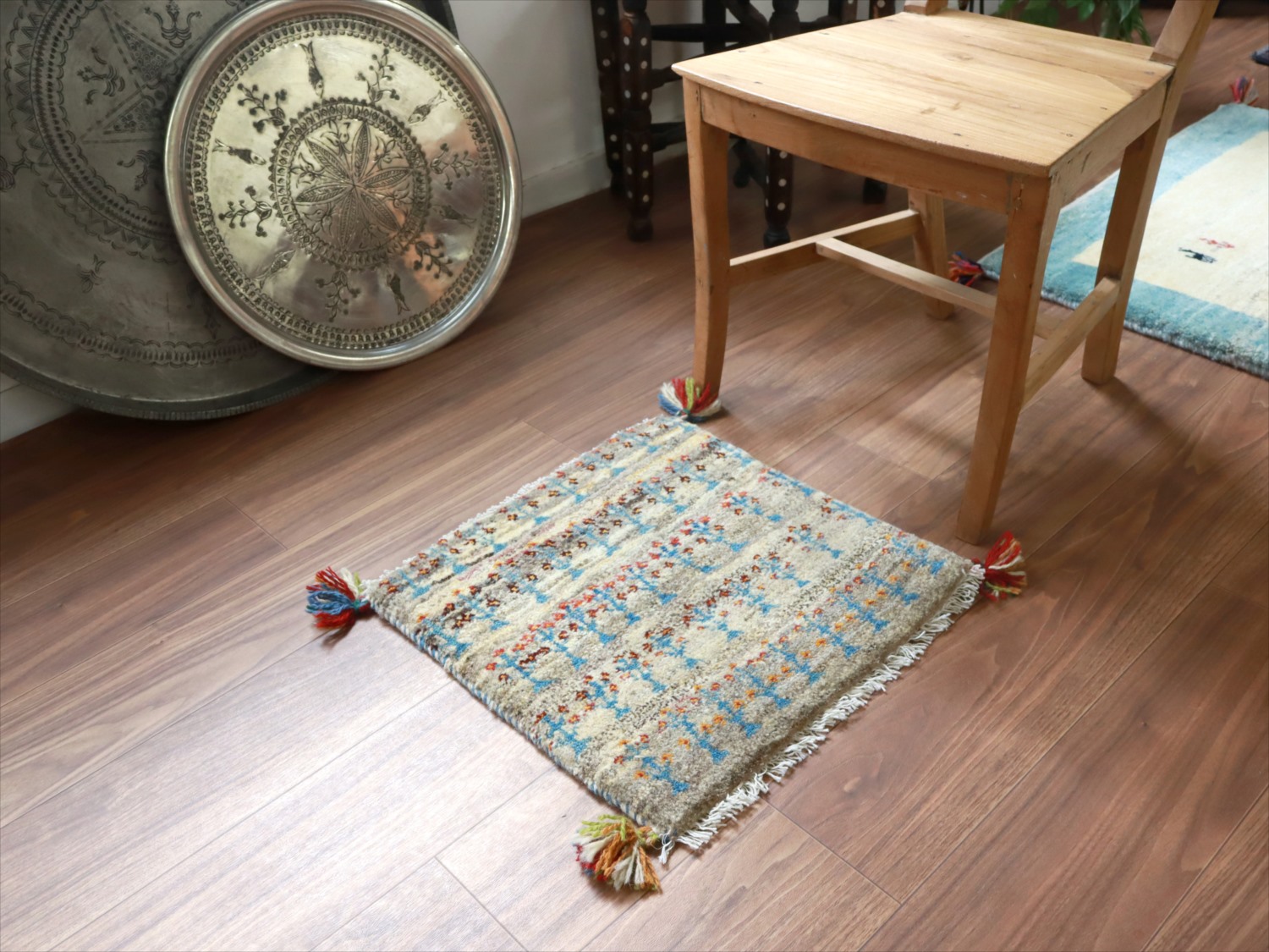 ギャッベ イラン産手織り 座布団サイズ 45x45cm グレーグラデーション 草花