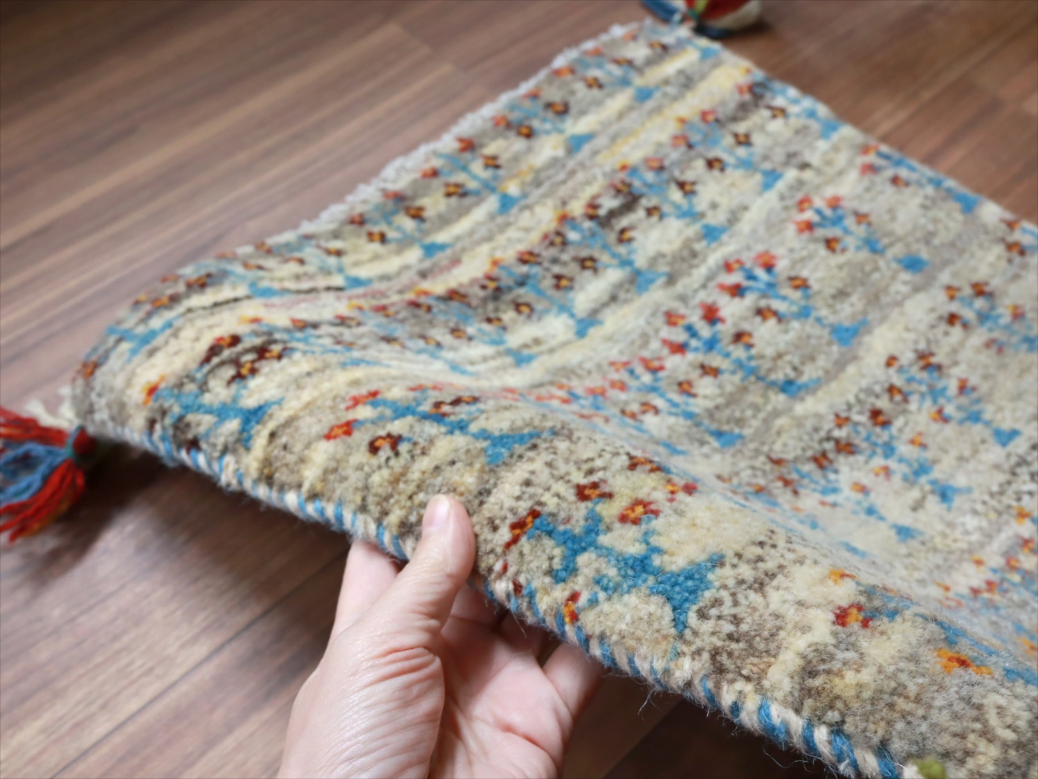 | 毛足が長くボリュームあるふっくらとした織り地のギャッベ。パイル(毛足)を含めた厚みは2.3-2.4cmほどで、分厚いという表現がぴったりの手織り絨毯です。 |