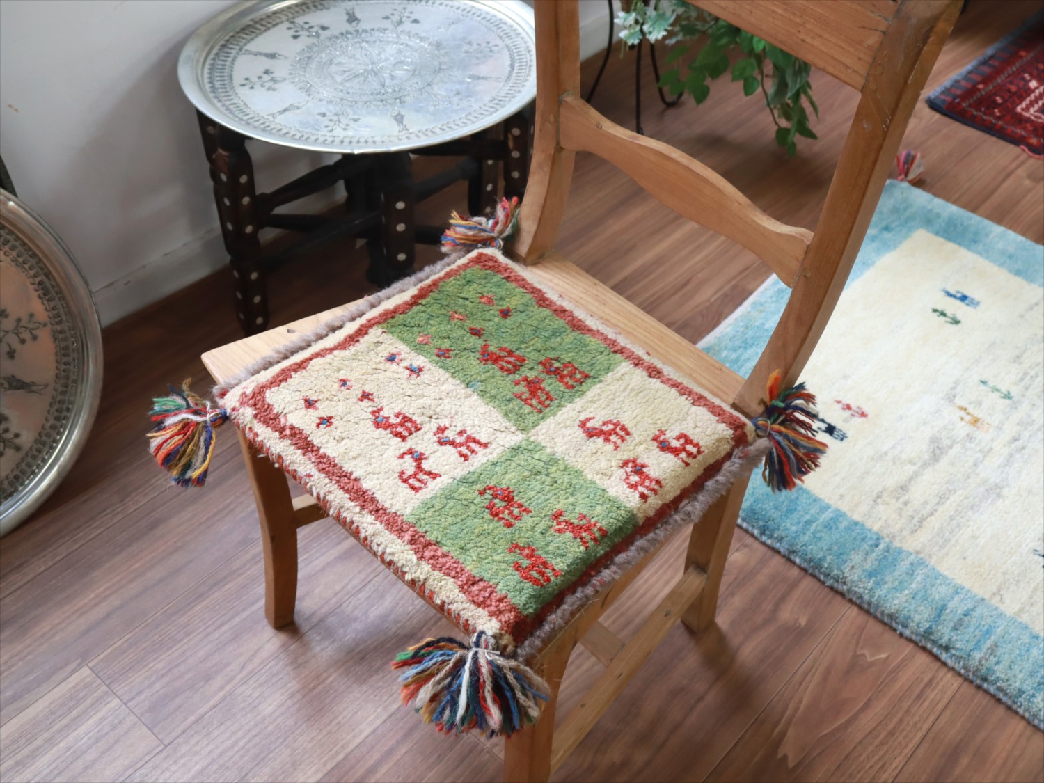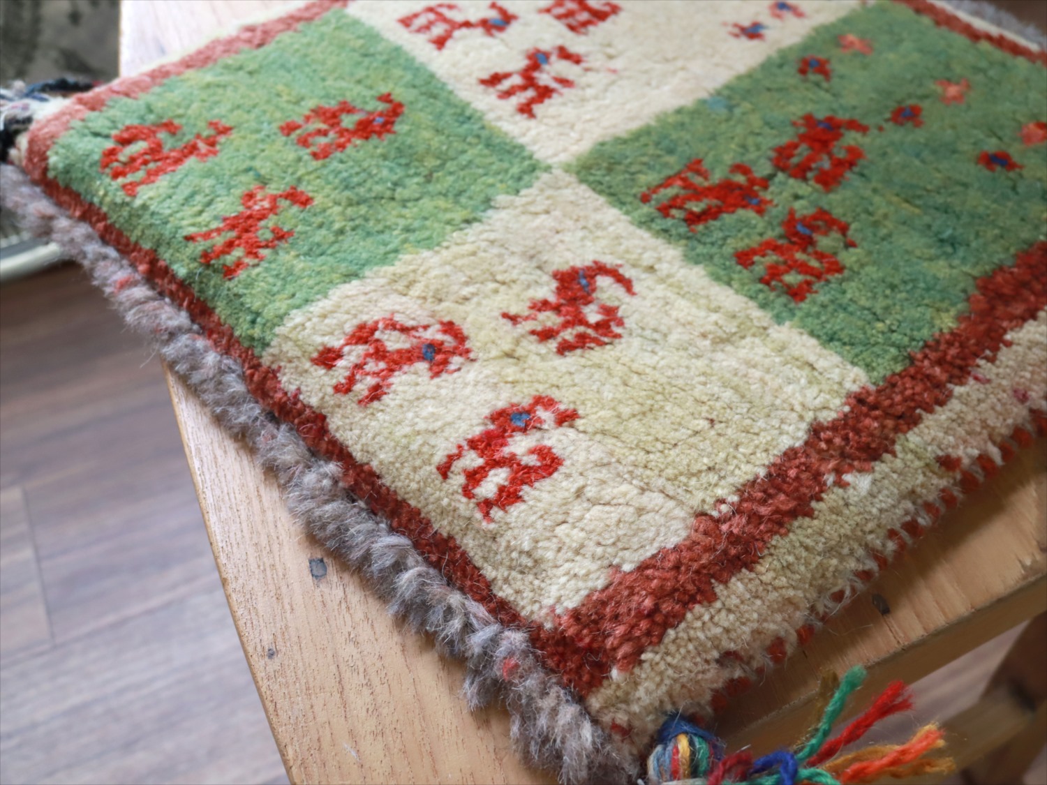 ギャッベ イラン産手織り 座布団サイズ 36x34cm クリーム色とグリーン