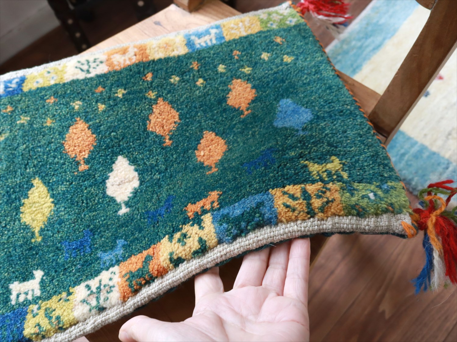 ギャッベ イラン産手織り 座布団サイズ 34x39cm グリーン