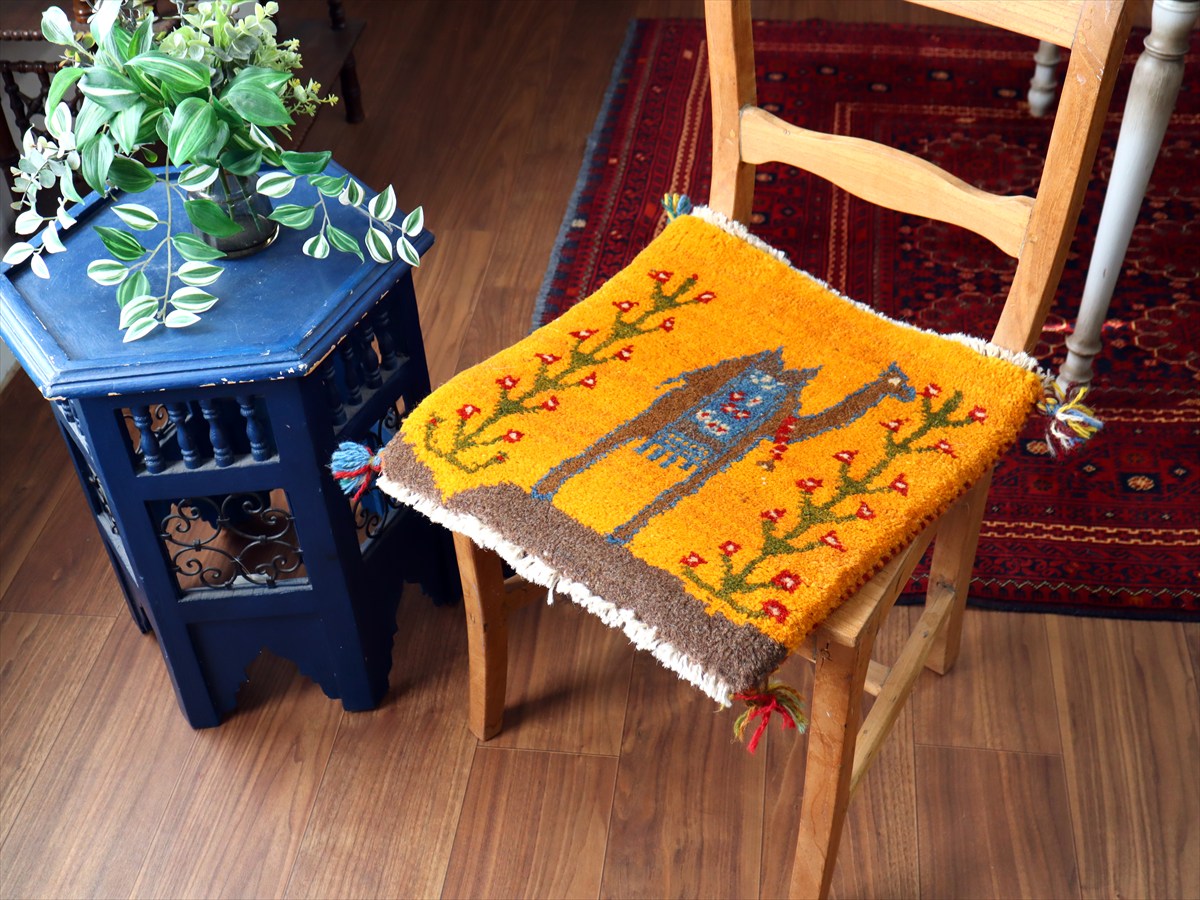 - ギャッベ イラン産手織り 座布団サイズ43×40cm オレンジ ラクダと生命の木