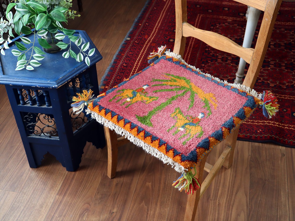 ギャッベ イラン産手織り 座布団サイズ41×43cm マゼンダ 向かい合う馬と遊牧民