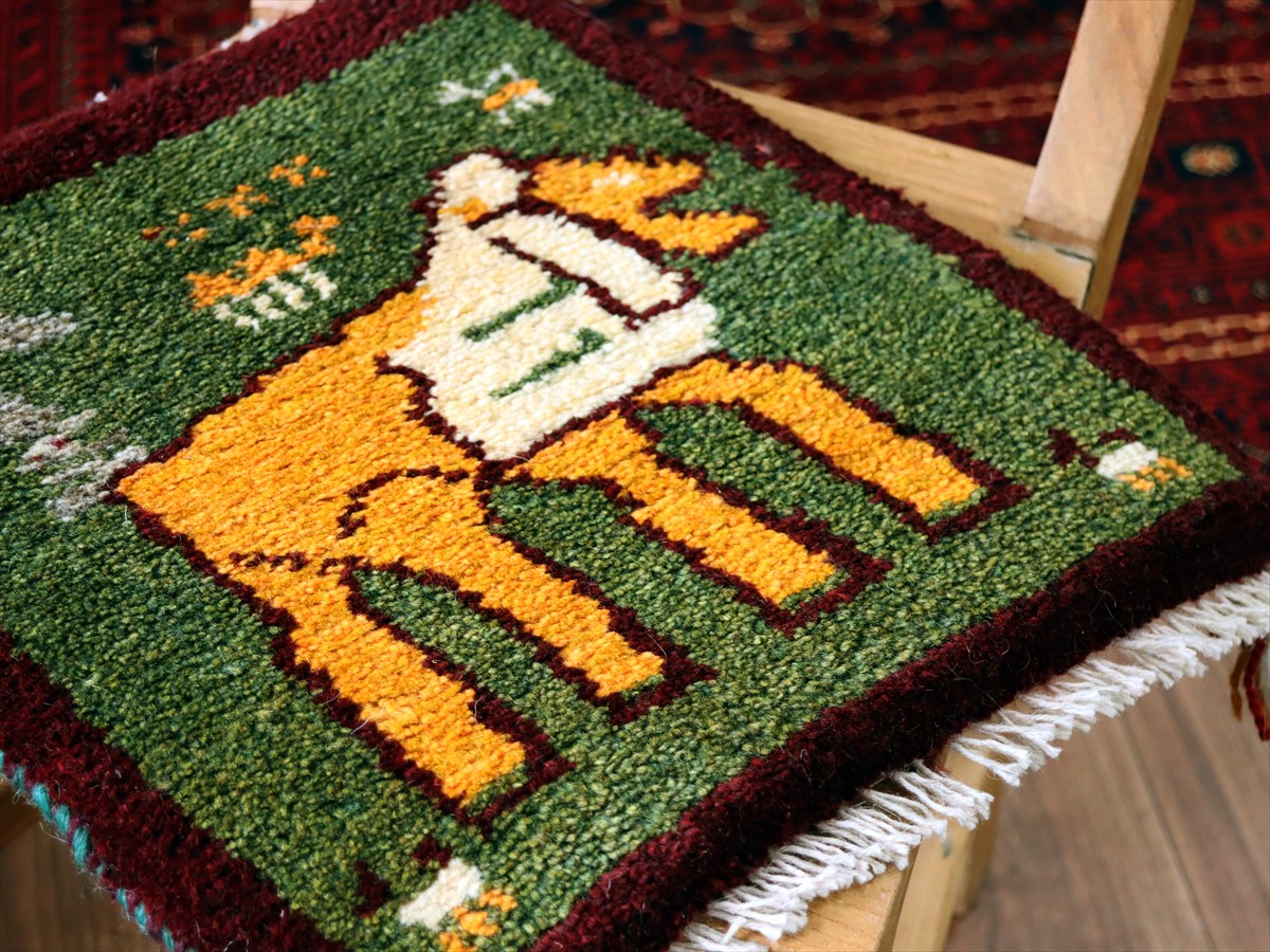 ギャッベ イラン産手織り 座布団サイズ40×37cm グリーン&イエロー 鋭い目つきのライオン