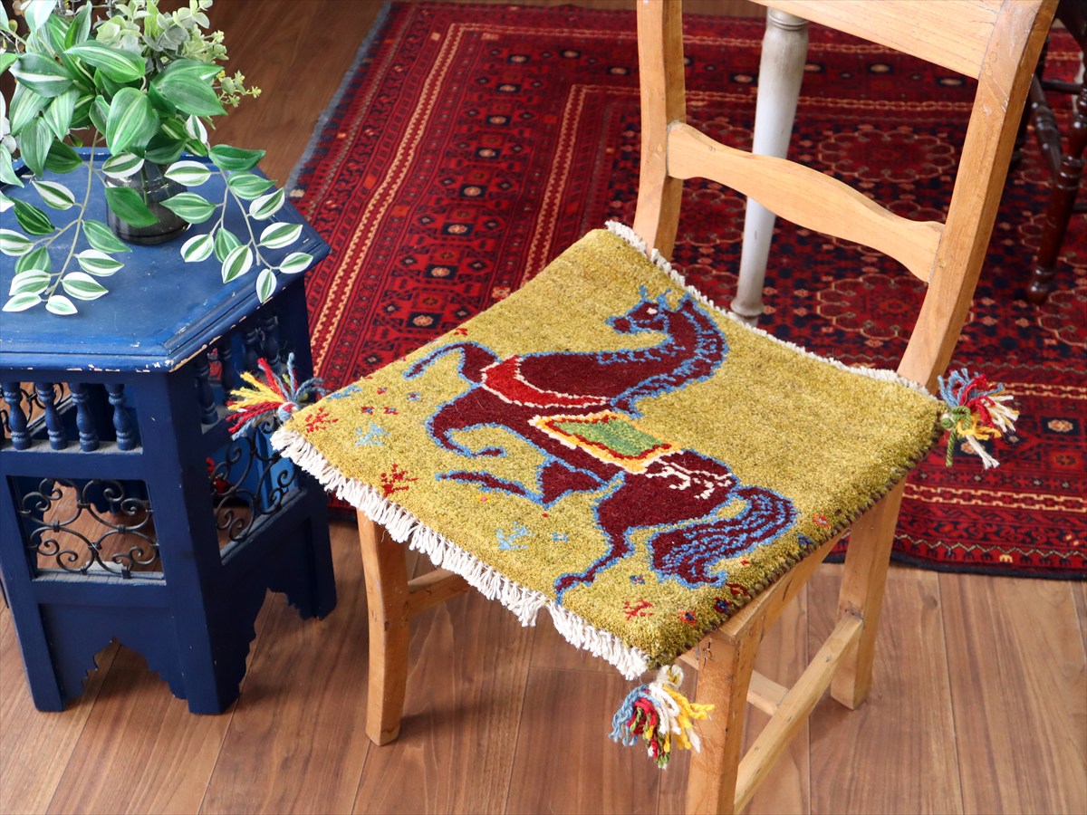 ギャッベ イラン産手織り 座布団サイズ41×44cm モスグリーン 躍動する馬