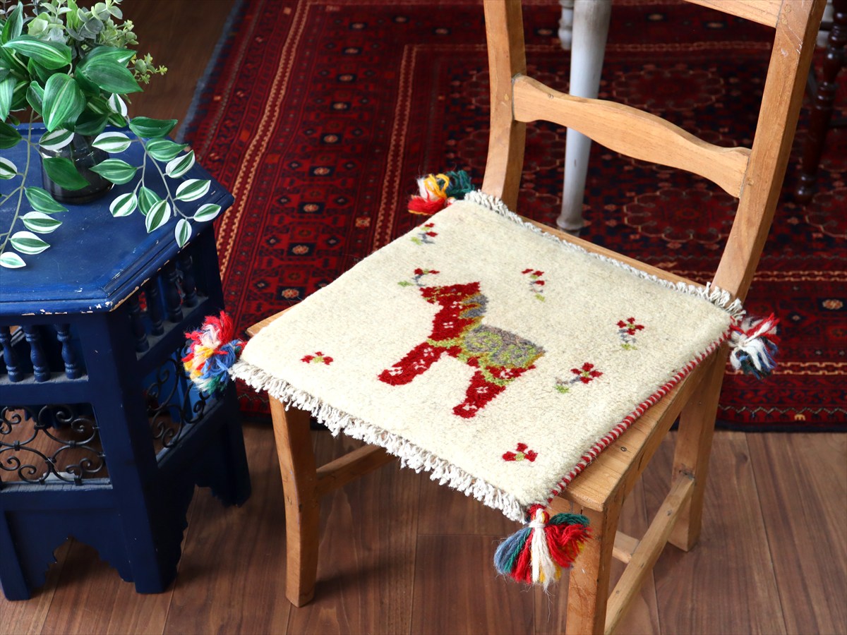 - ギャッベ イラン産手織り 座布団サイズ37×38cm ナチュラルアイボリー フラワーと馬