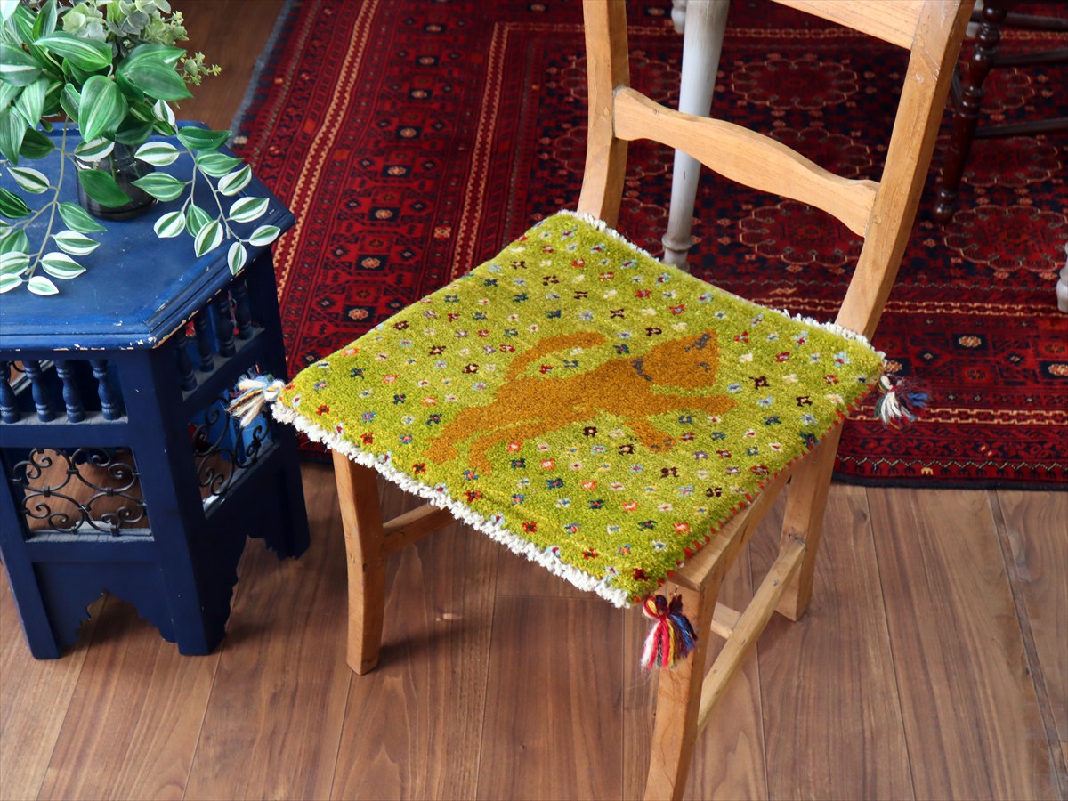 ギャッベ イラン産手織り 座布団サイズ39×41cm グリーン 猫とドット