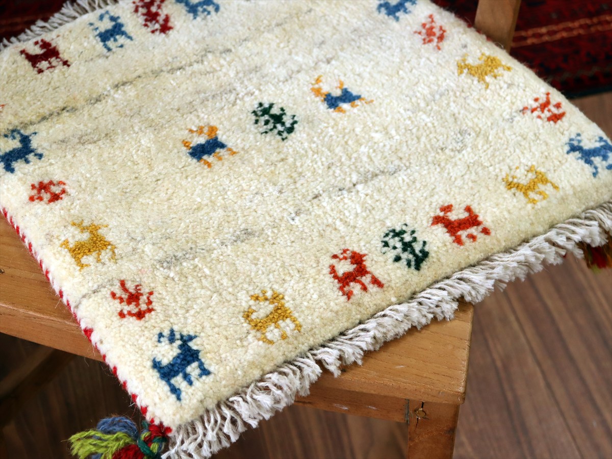 ギャッベ イラン産手織り 座布団サイズ40×40cm ナチュラルアイボリー 動物と生命の木