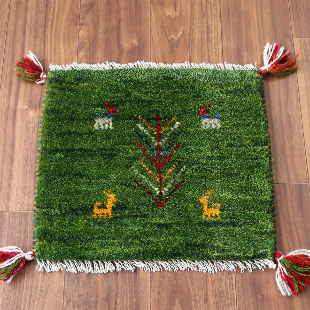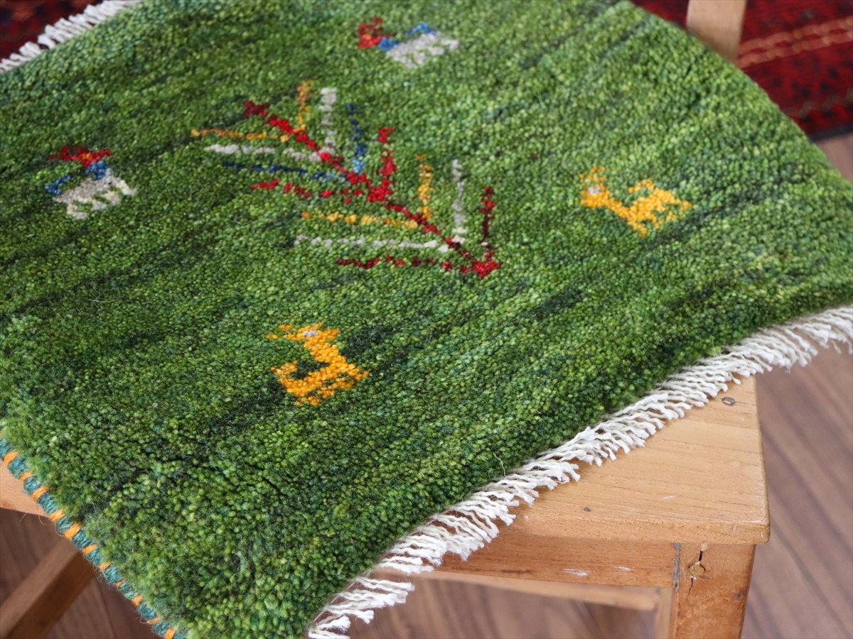 ギャッベ イラン産手織り 座布団サイズ41×45cm グリーン 生命の木と動物