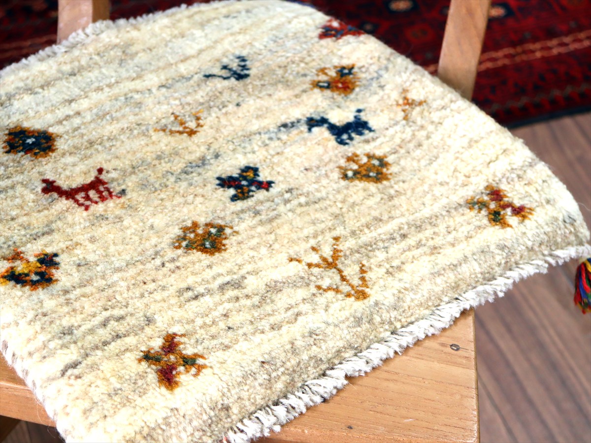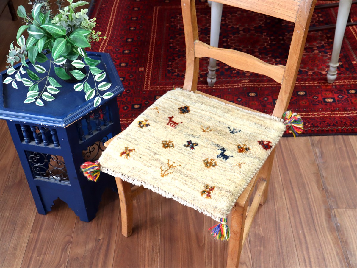 ギャッベ イラン産手織り 座布団サイズ39×40cm ナチュラルアイボリー 動物と生命の木
