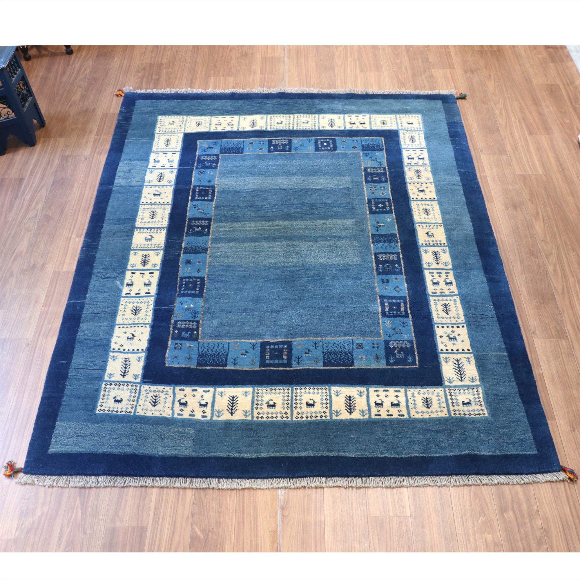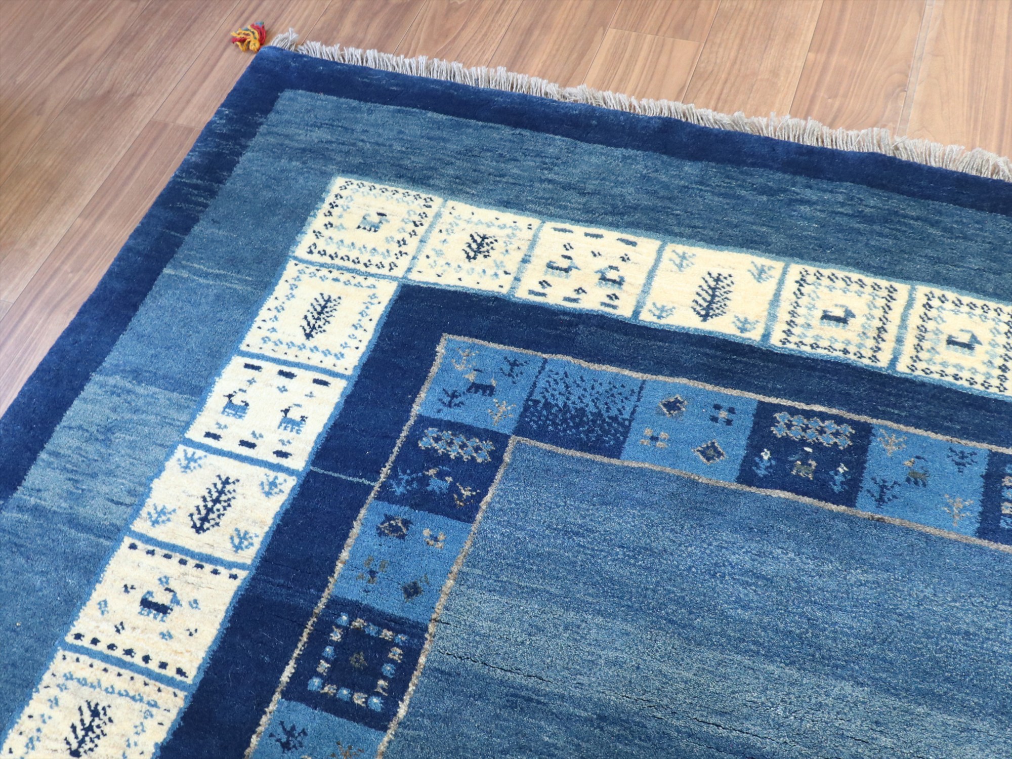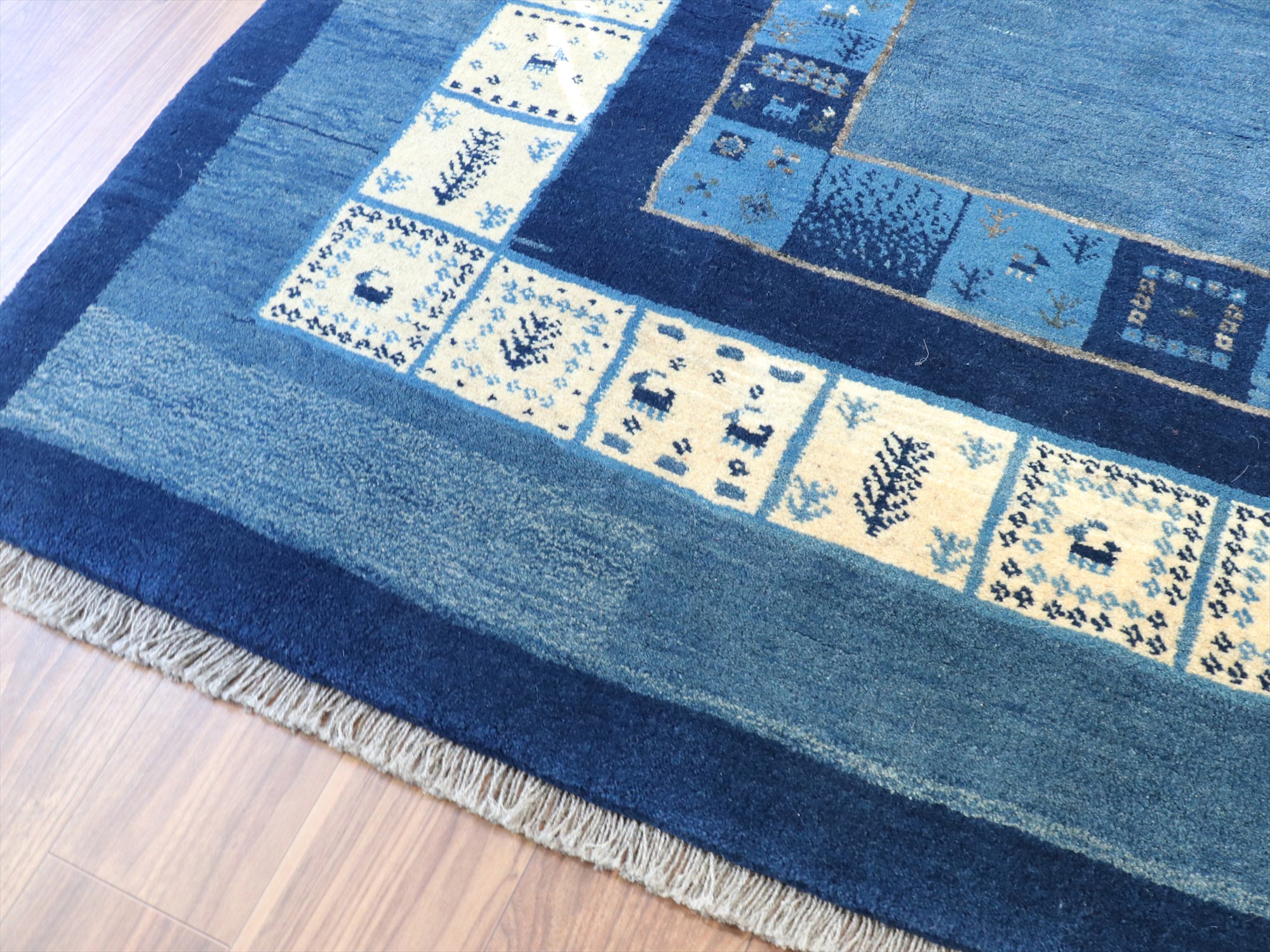 | 爽やかなブルー、ネイビーに、羊毛のアイボリーのボーダー(額縁)の入ったデザイン。タイルのようなデザインの中には、小さな動物や生命の木が織り込まれ、ひとつひとつにストーリーがあるような、楽しいデザインです。ベースのブルーは、染めのトーンが違う色が使われてグラデーションができています。 横幅が広く正方形に近い形で、リビングに合わせやすいサイズです。 |