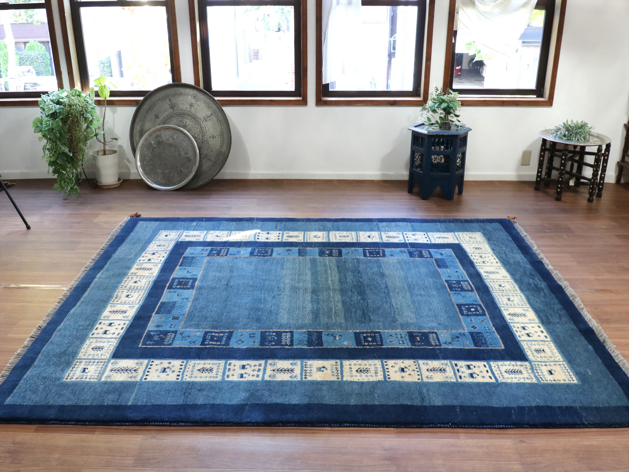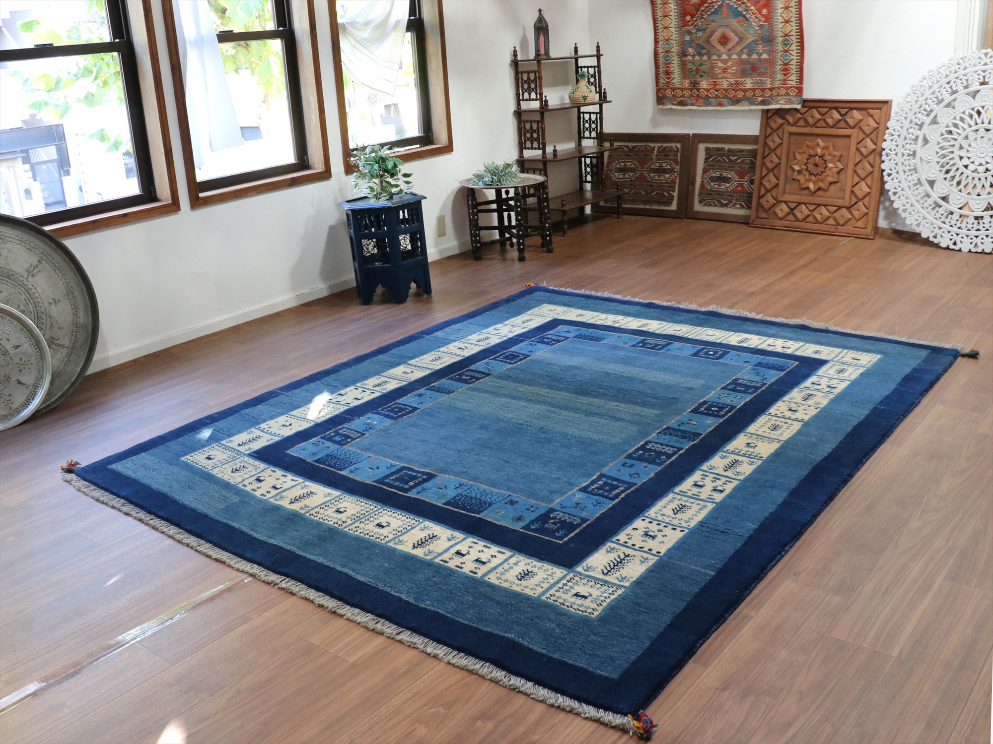 ギャベ カシュカイ族の手織りラグ 246x198cm 明るいブルー 二重のボーダー イラン 手織り